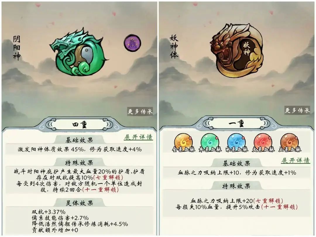 4.阴阳神:阳神体质:右上方可装配第二个灵体,加上灵体界面装配的,就是两个灵体。.阳神体质效果:能够在第二个灵体上获得到效果的百分比。初始15%,每重增加10%,满级十一重为115%。没试过不知道效果如何.