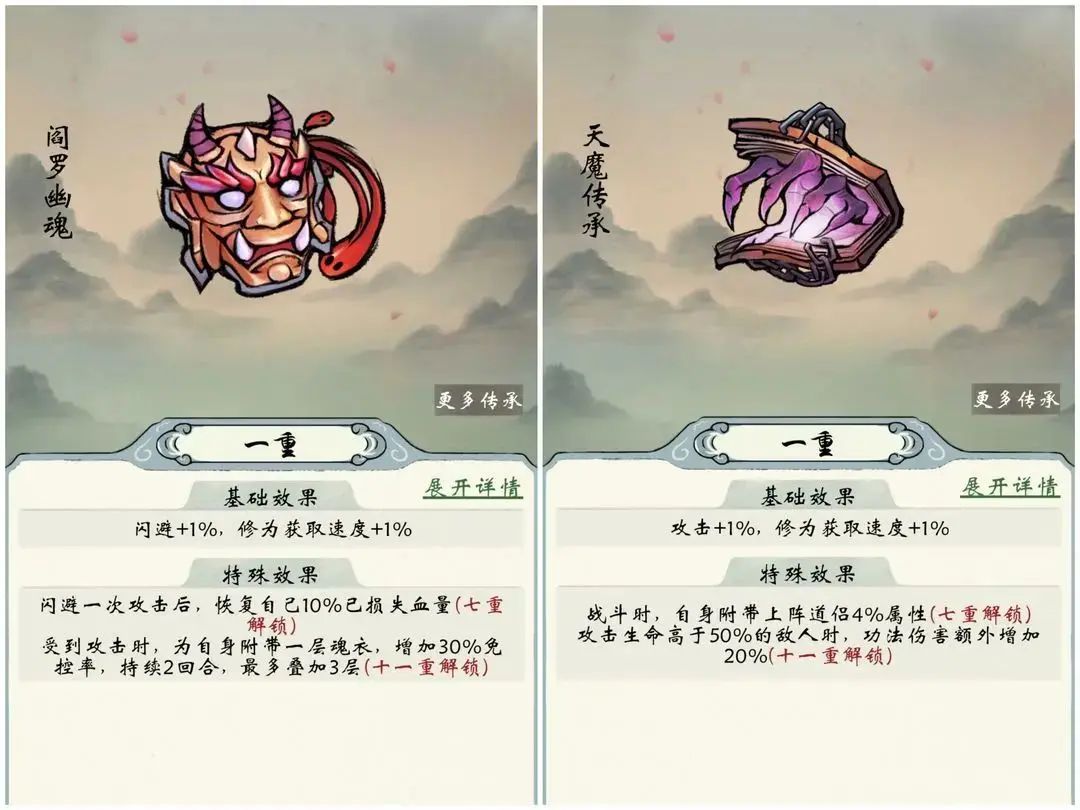 3.天魔传承:七重比较依赖强力道侣,这个4%仅仅为结为道侣的人提供的,前期比较鸡肋,氪佬可以试试橙道精进满后的效果。十一重开场输出最强,适合回合数较少的主角秒人局。