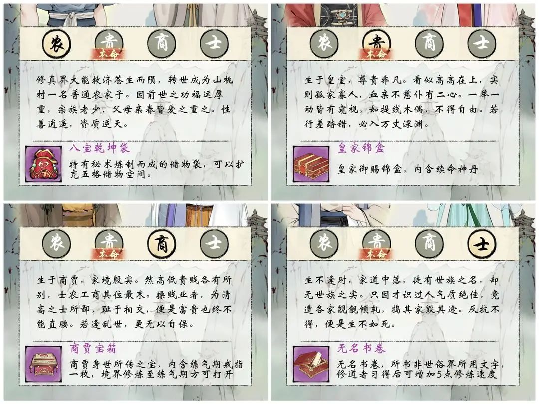四个身世差距不大,喜欢极限修炼速度的可以选士族,前面厉害一点的可以选皇室+500血开局,其他两个不建议.