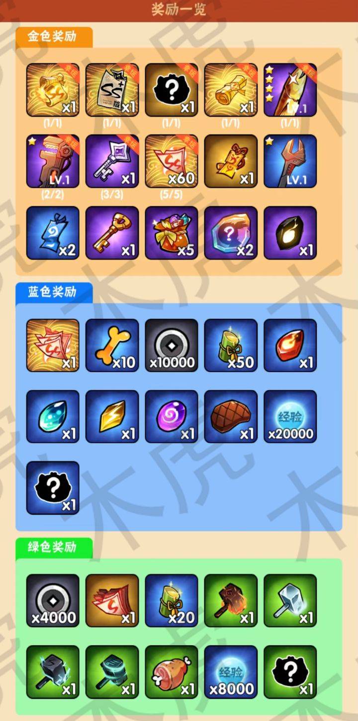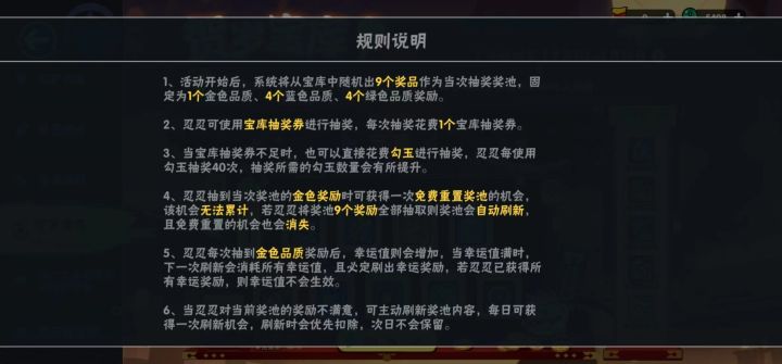 每次9个奖品(1金4蓝4绿),每日可免费刷新1次(不累加不加幸运值),抽出金后可选择主动刷新,三次出金后必定幸运奖励。