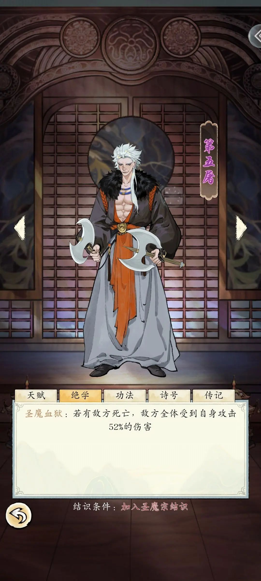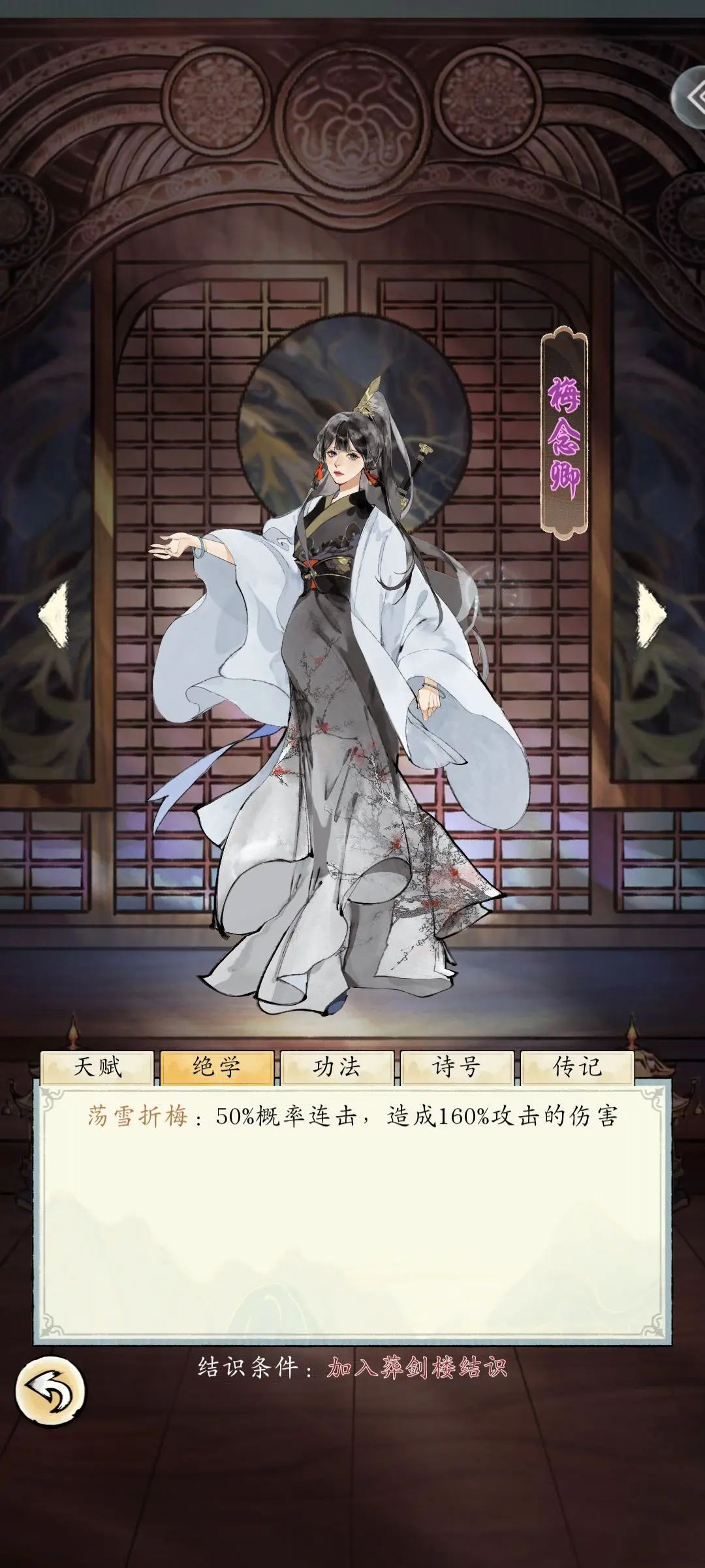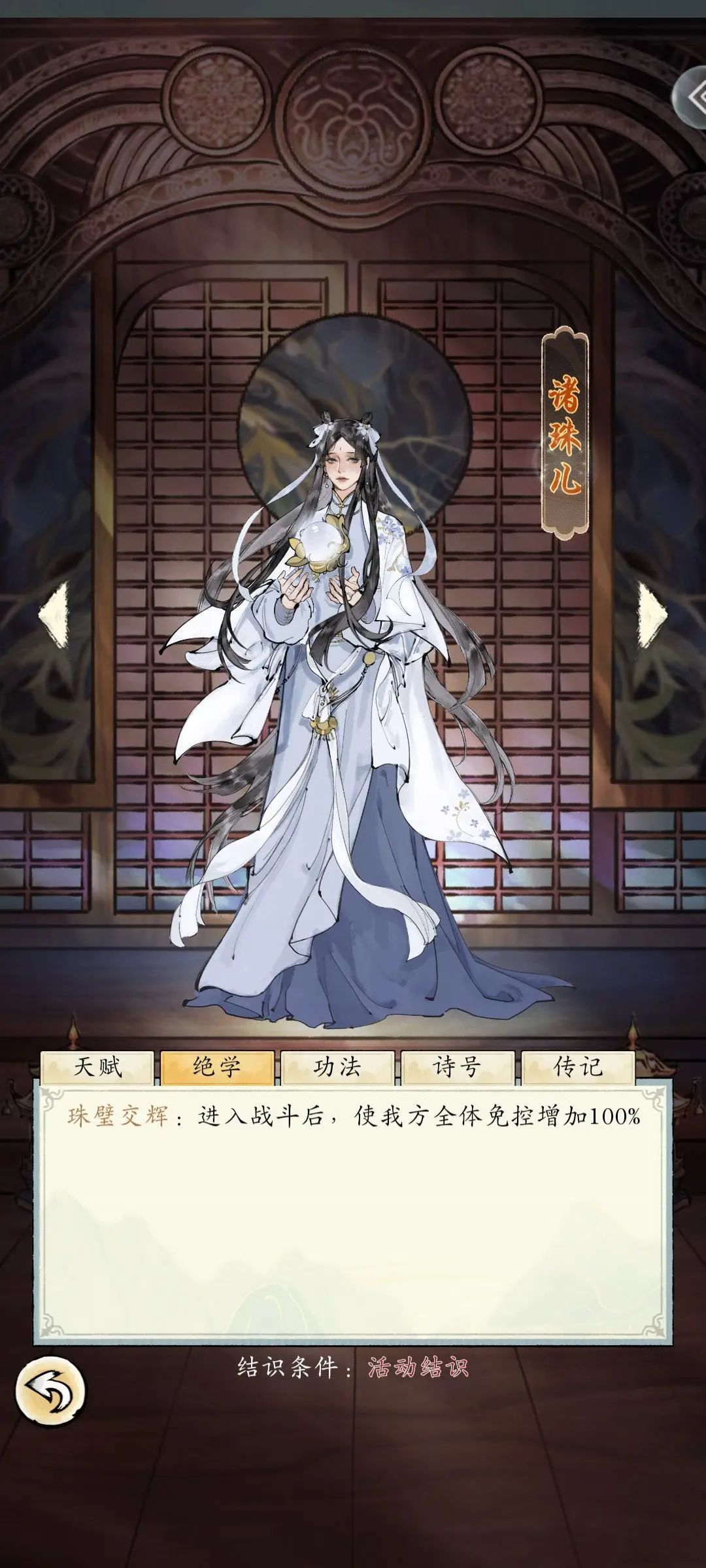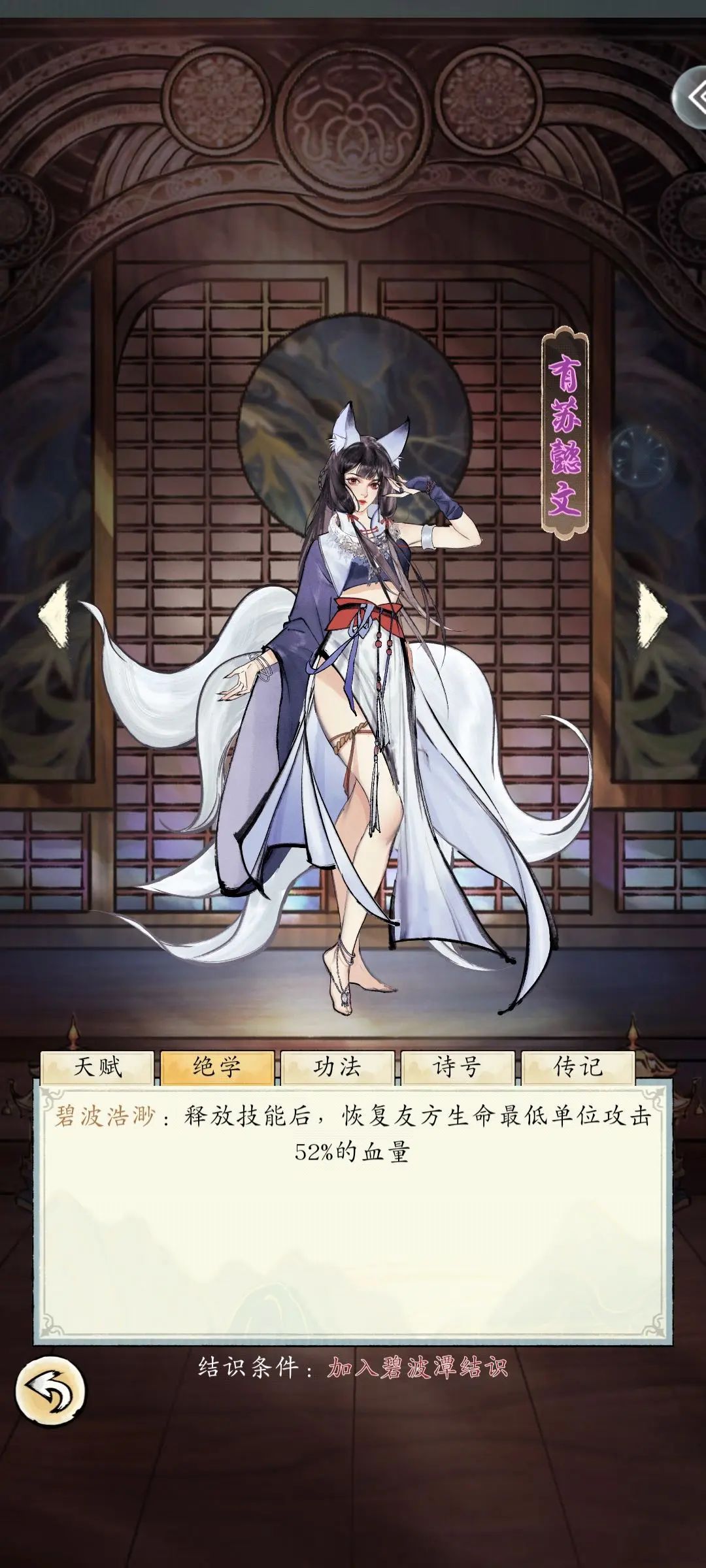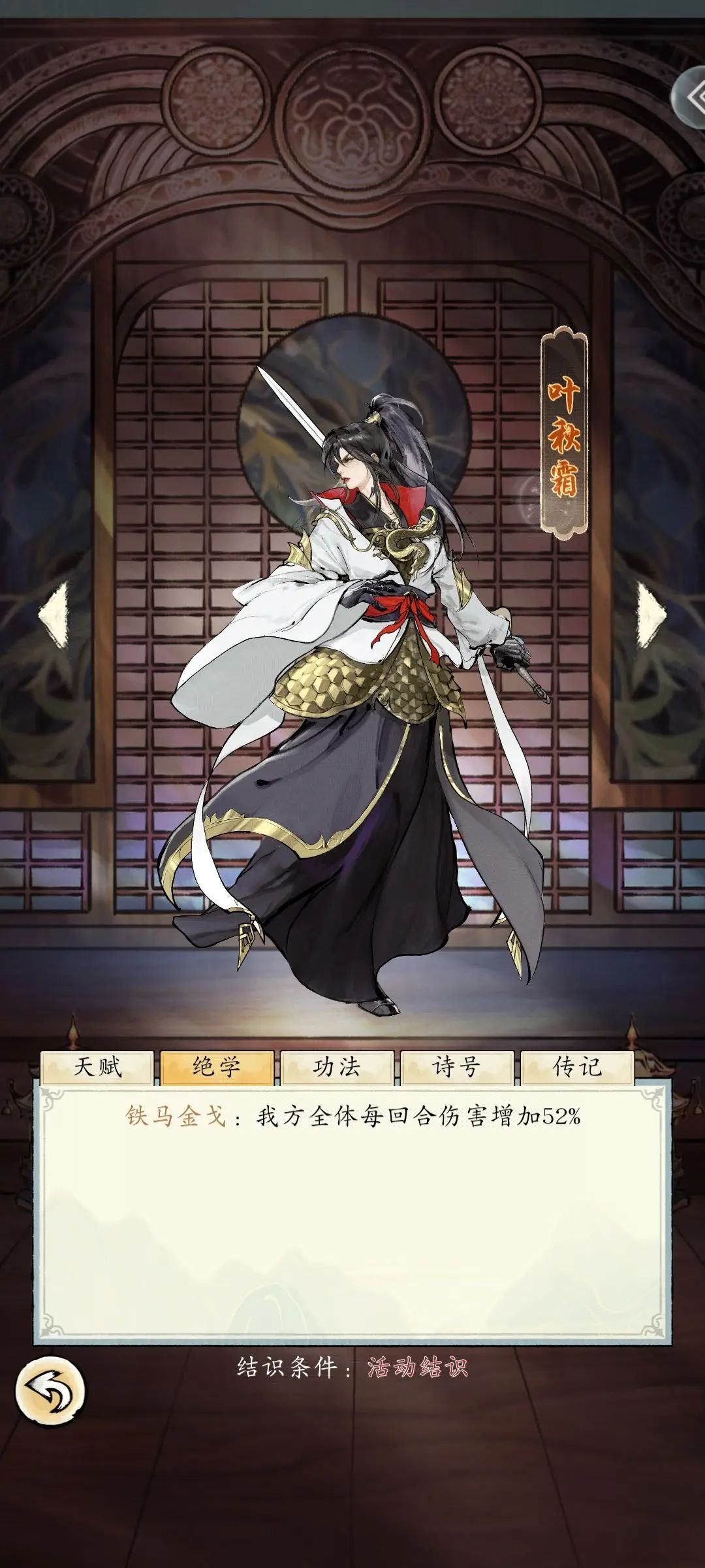 叶秋霜天赋加24%生命值,绝学每回合伤害增加52%