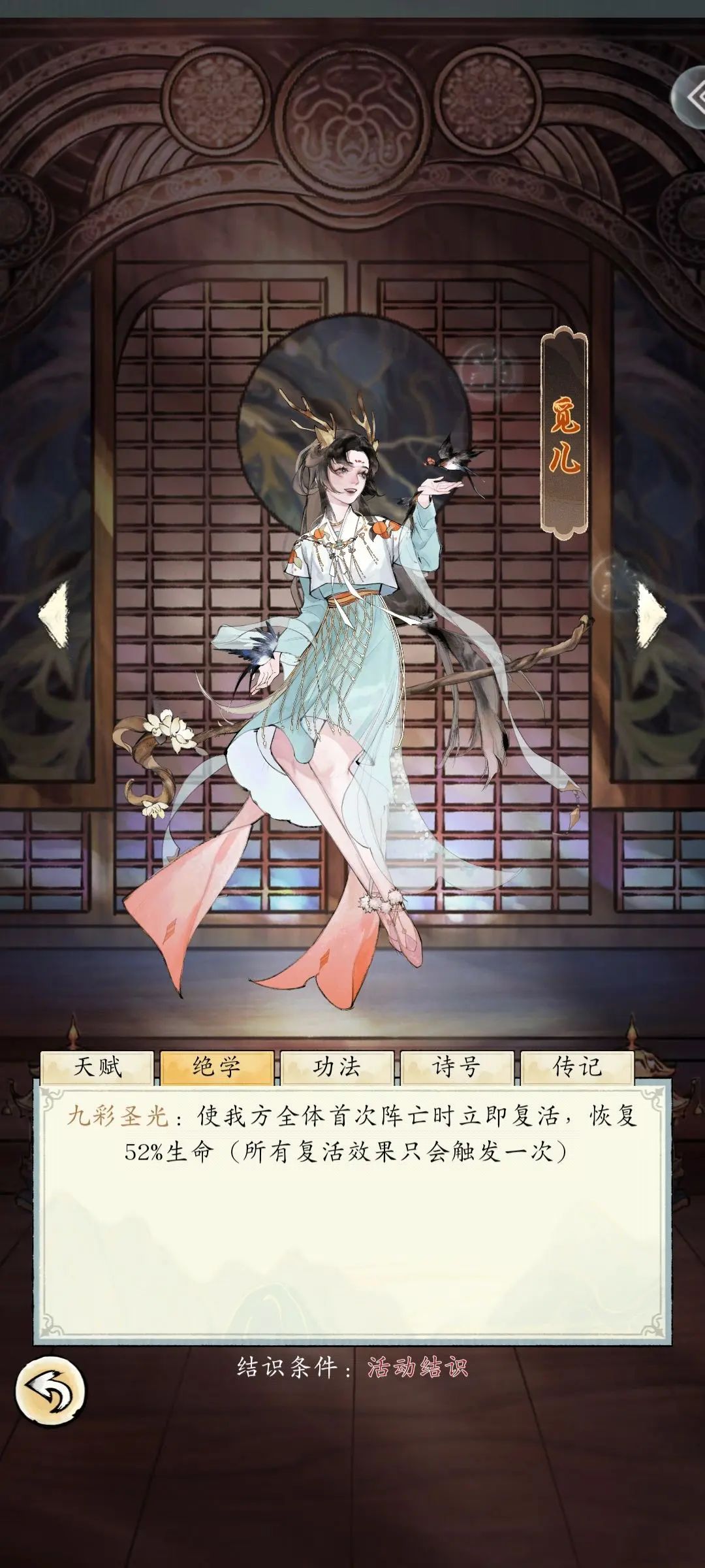 天赋增加48%的物抗,绝学是全体复活,重点全体首次阵亡