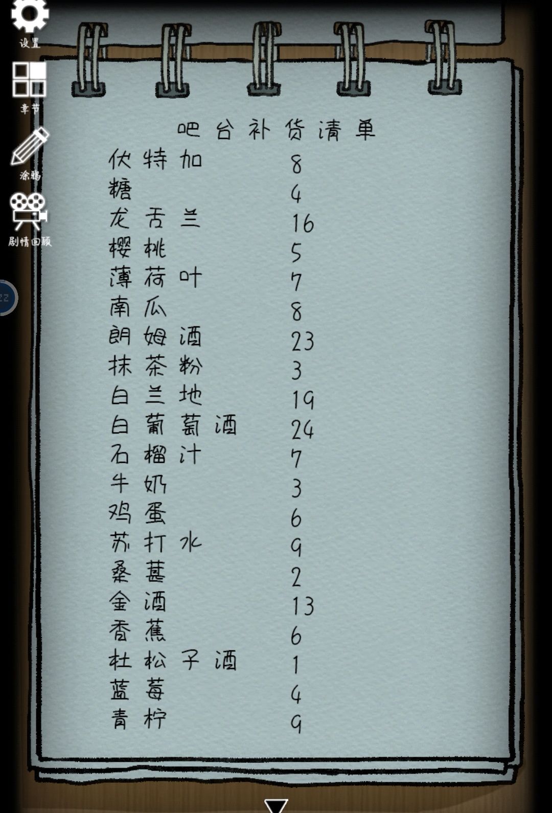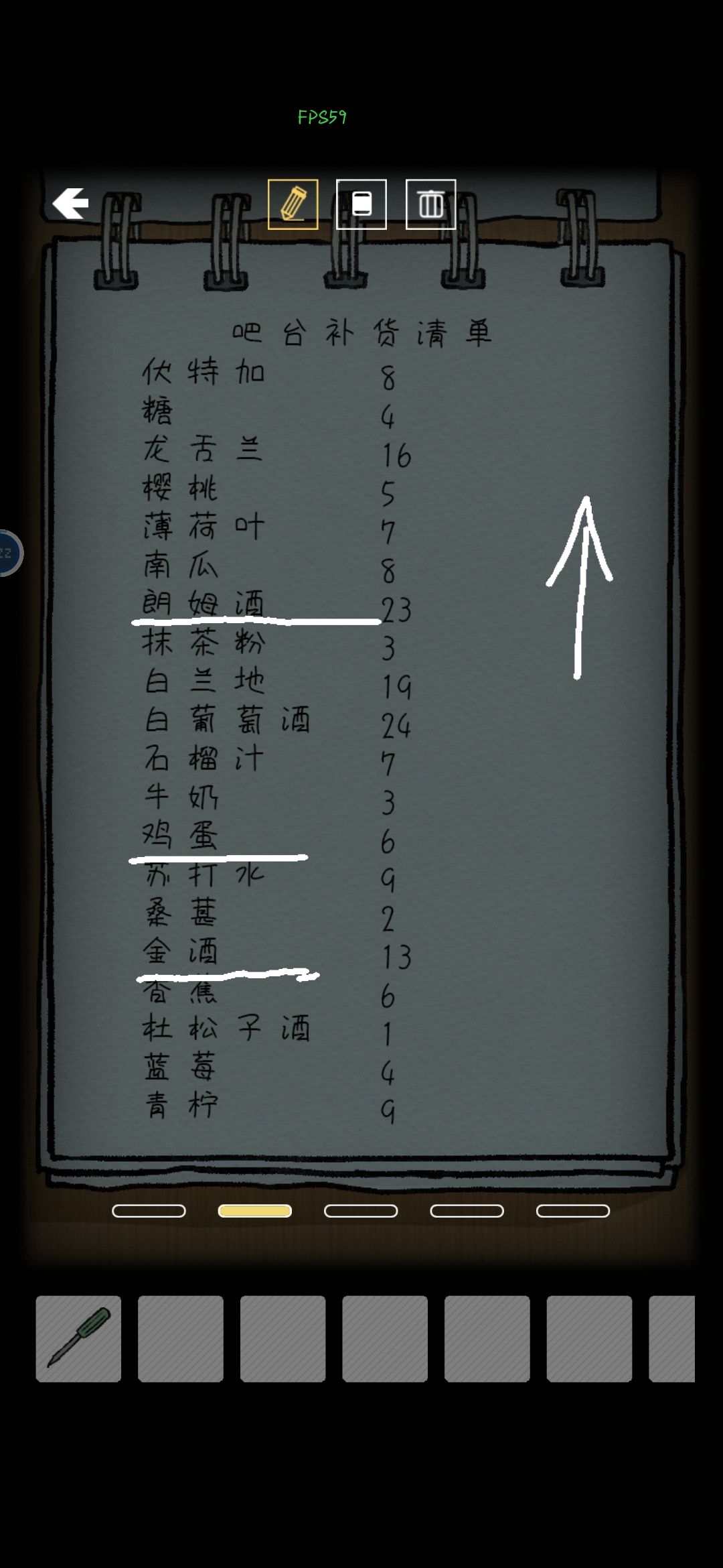 用牙刷划掉床旁边未干的木漆,按照横线位置和箭头方向在补货清单里得到第三层抽屉的密码13623(自己一个个照着对不是特别容易,可以点开左上侧箭头里的涂鸦把这三条线描上,再到补货清单处打开涂鸦,从下往上就是金酒13、鸡蛋6、朗姆酒23,密码13623),里面是拼图片7。