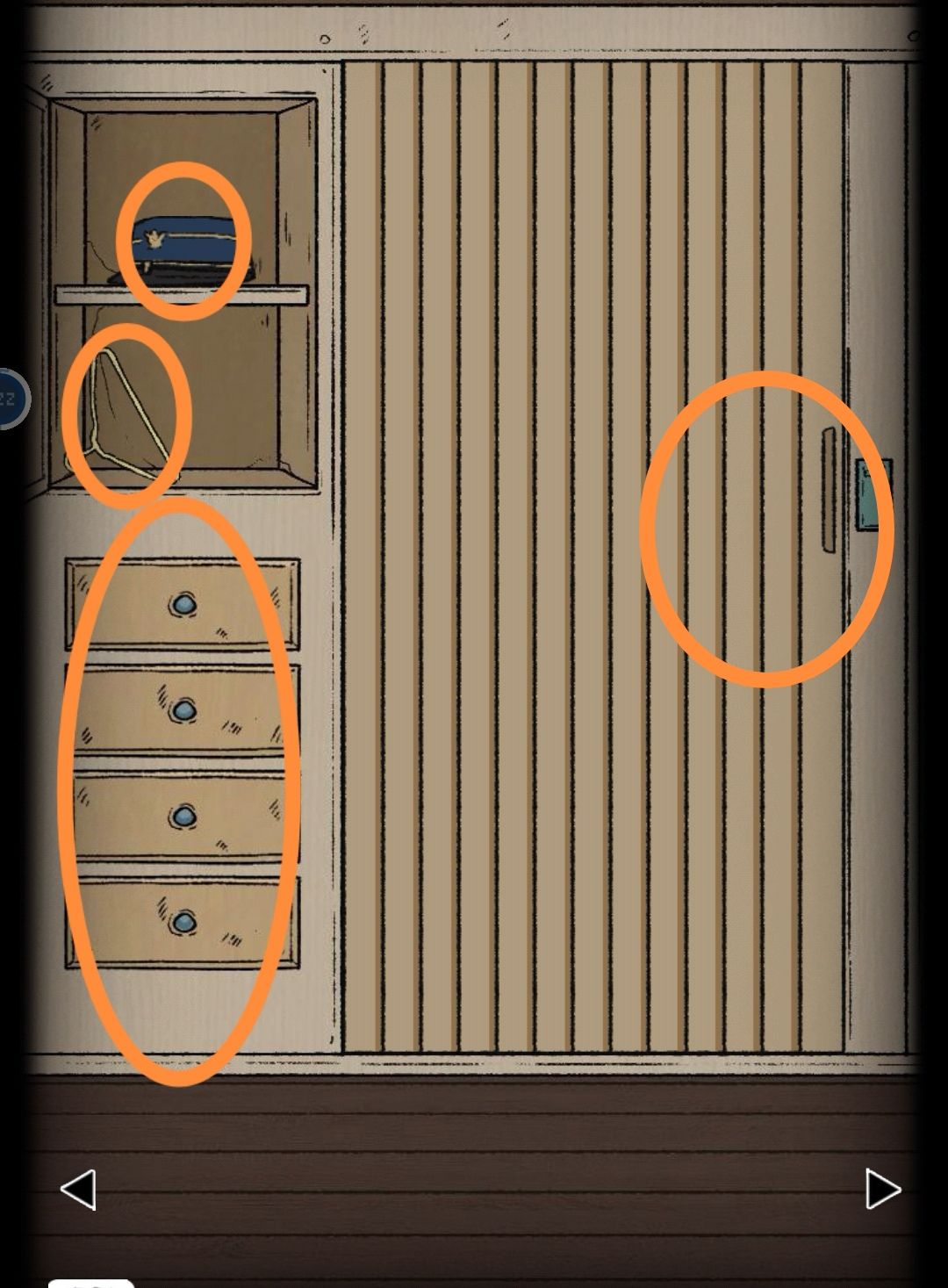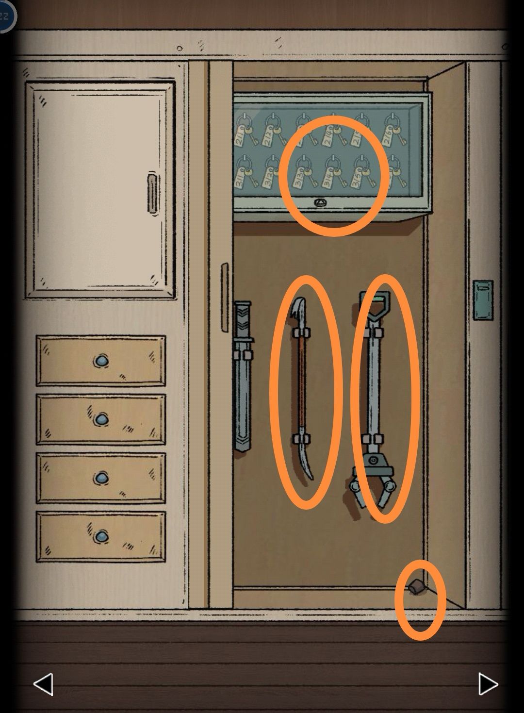 左侧最上面的大柜子打开,帽子下面有个拼图片3,用钳子点衣架得到钩子。下面的四个抽屉(从上往下)第一层是吧台补货清单,第二层用钥匙B打开,得到螺丝刀。第三层是数字密码,第四层是字母密码,大门是数字密码。(好多密码,救命要涨脑子了