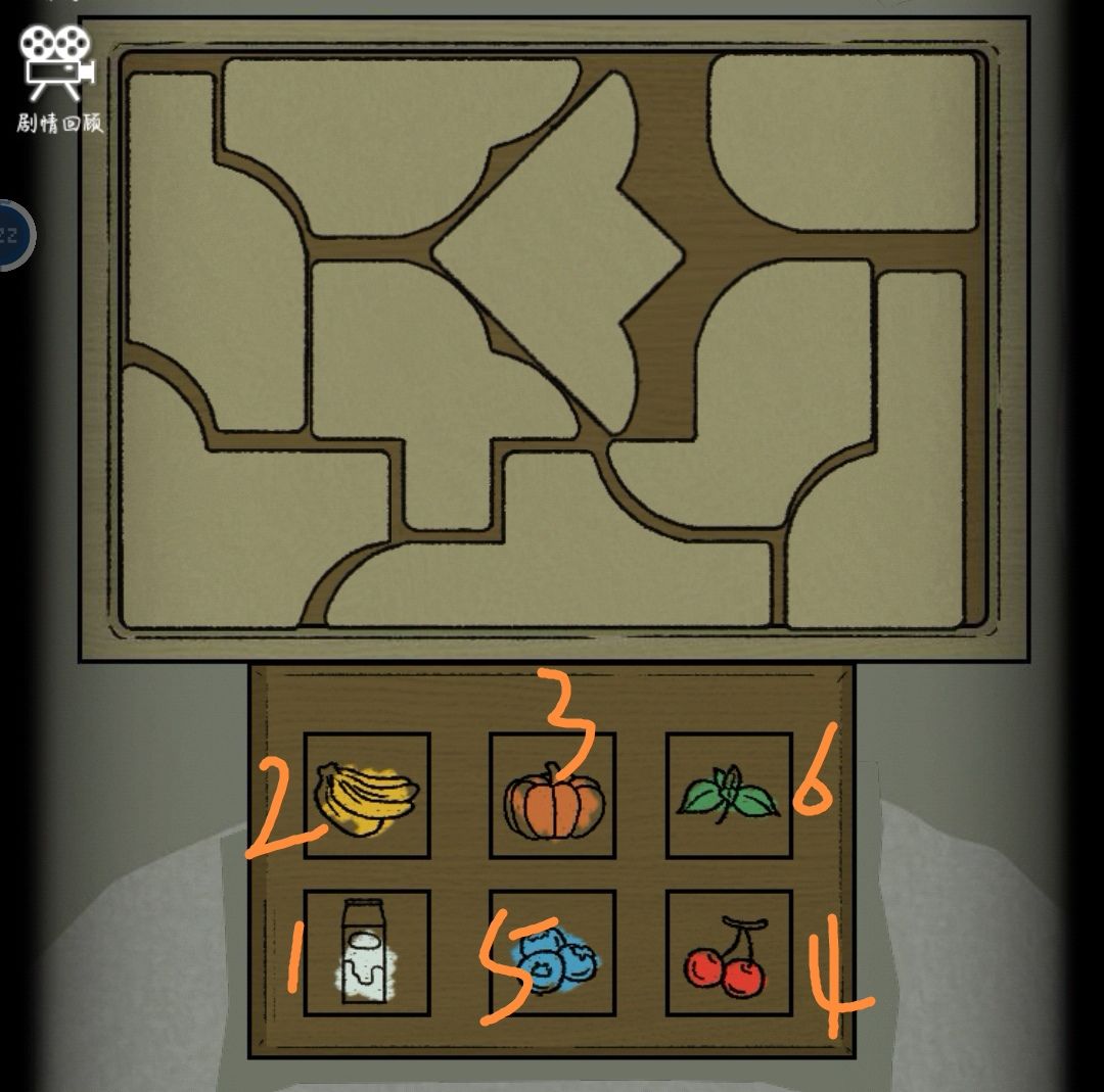 把所有图片都放在床上的盒子里拼图(所有图片不叠加),得到物品图样,再按照台灯依次的颜色顺序(白、黄、棕、红、蓝、绿),根据补货清单里的物品数量(香蕉6、南瓜8、薄荷叶7、牛奶3、蓝莓4、樱桃5)得到门的密码368547。