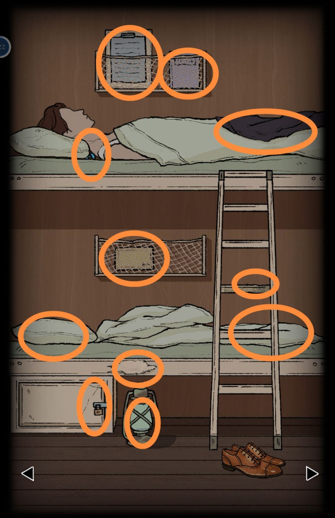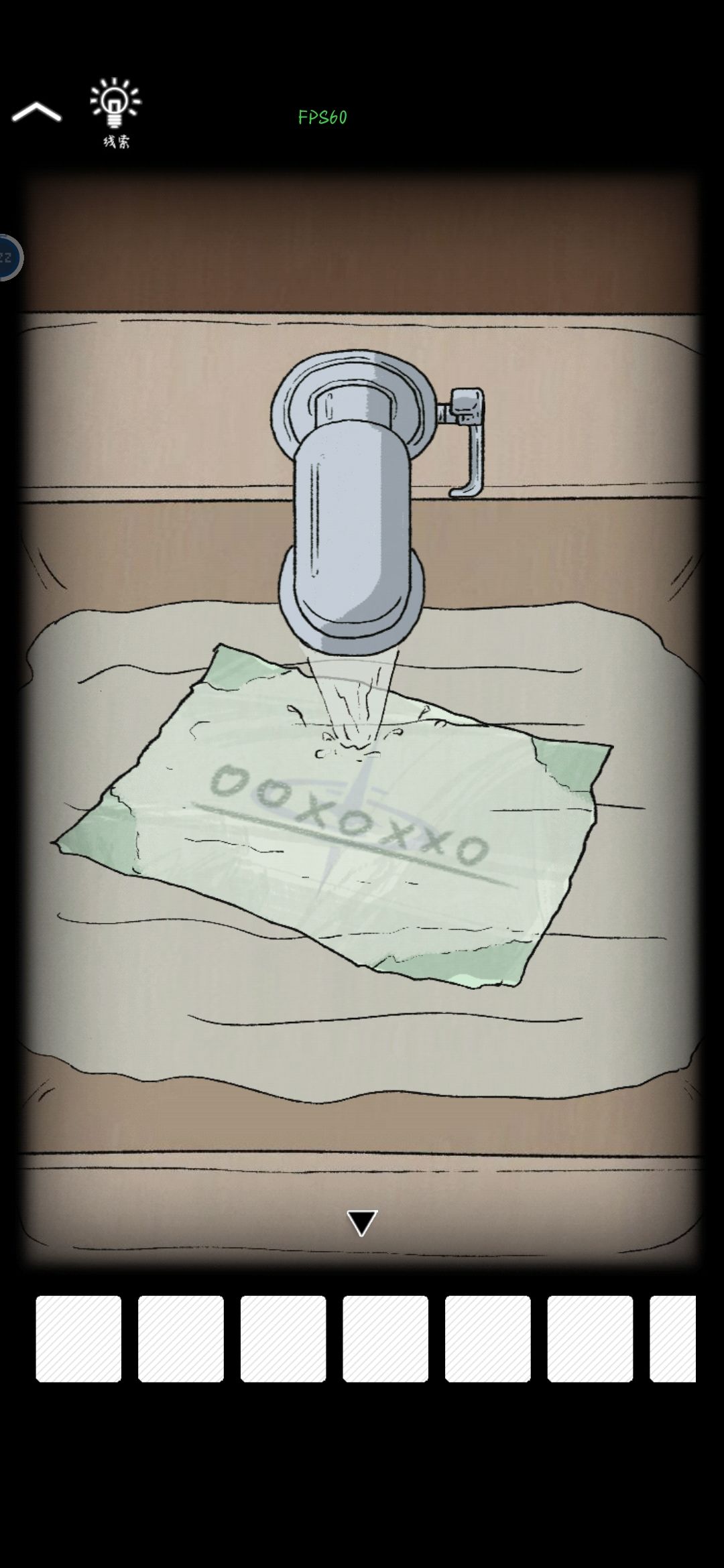 去卫生间用软塞堵住下水道口,放水把纸放里面(退出再重新点洗脸池,需要刷新一下场景),发现水里的纸和二层床网左侧板子上夹的纸上图标一样,右下角有字母,按照OOXOXXO,第四层抽屉是4个英文字母,密码是4个O的位置就是FLRN,得到钥匙A。