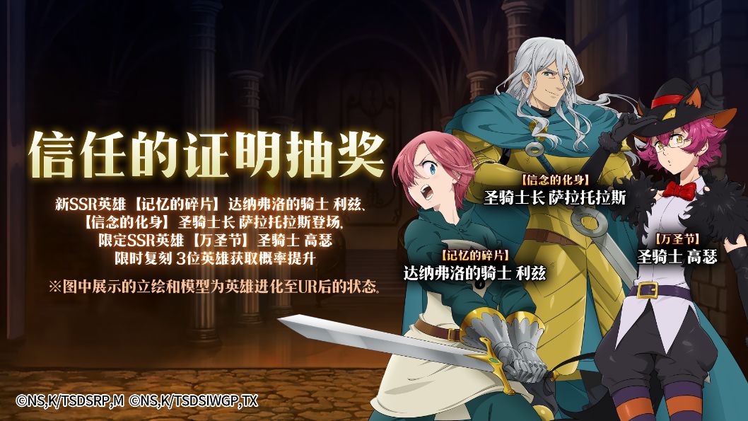活动介绍:活动持续时间,新SSR英雄【记忆的碎片】达纳弗洛的骑士 利兹、【信念的化身】圣骑士长 萨拉托拉斯登场,限定SSR英雄【万圣节】圣骑士 高瑟限时复刻,3位英雄获取概率限时提升!