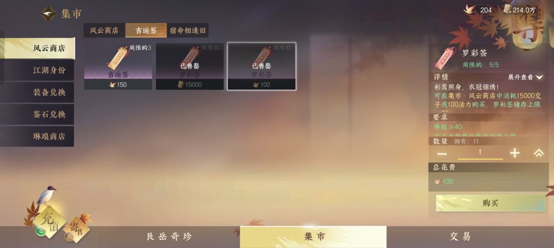 罗彩签是获取副本时装的签子,每个boss每周最多使用3次。