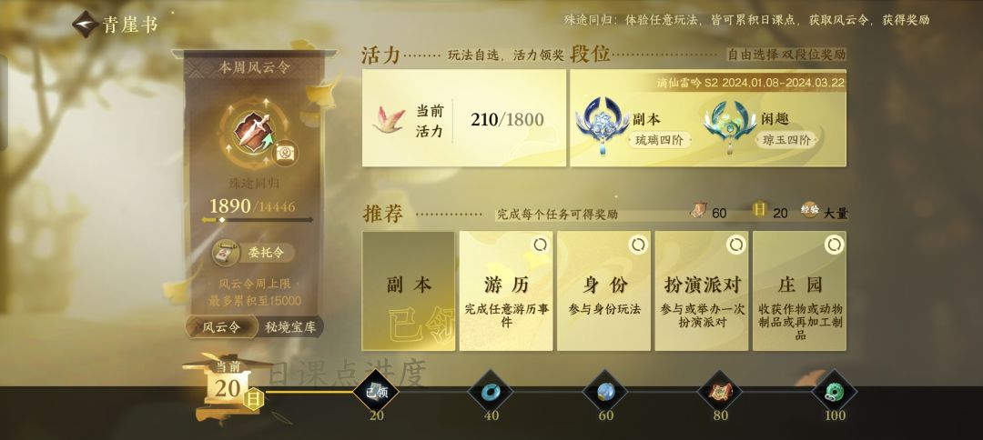 13.青崖书(每日必做):又称日课,做到100进度可得80纹玉,刷新🔄不要钱,连续刷新20次可以过一个成就。