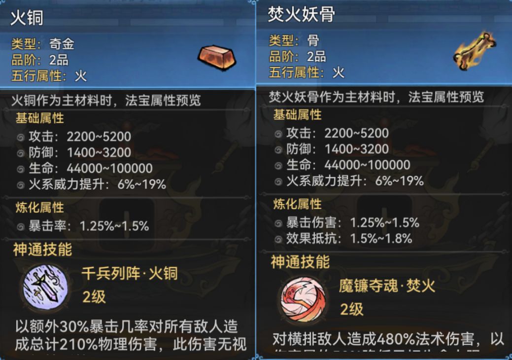 后期的时候可以直接无脑用火铜或者妖骨,可以先不管法宝的品质先用着,不用精炼太高级。作为目前的版本答案,焚火妖骨很好适配了火系功法,而且被神通技能击杀的敌人无法复活。在解锁了法宝炼化后,尽量给这种输出型法宝炼化玉鹿香茸(加暴击伤害)。