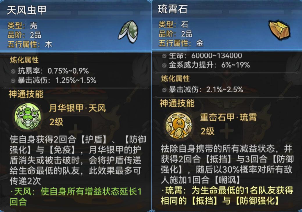 另外对于兵家弟子的法宝,天风虫甲就很不错,在施加护盾、防御强化和免疫的同时,如果这层效果被击破将会传递给生命最低的队友。