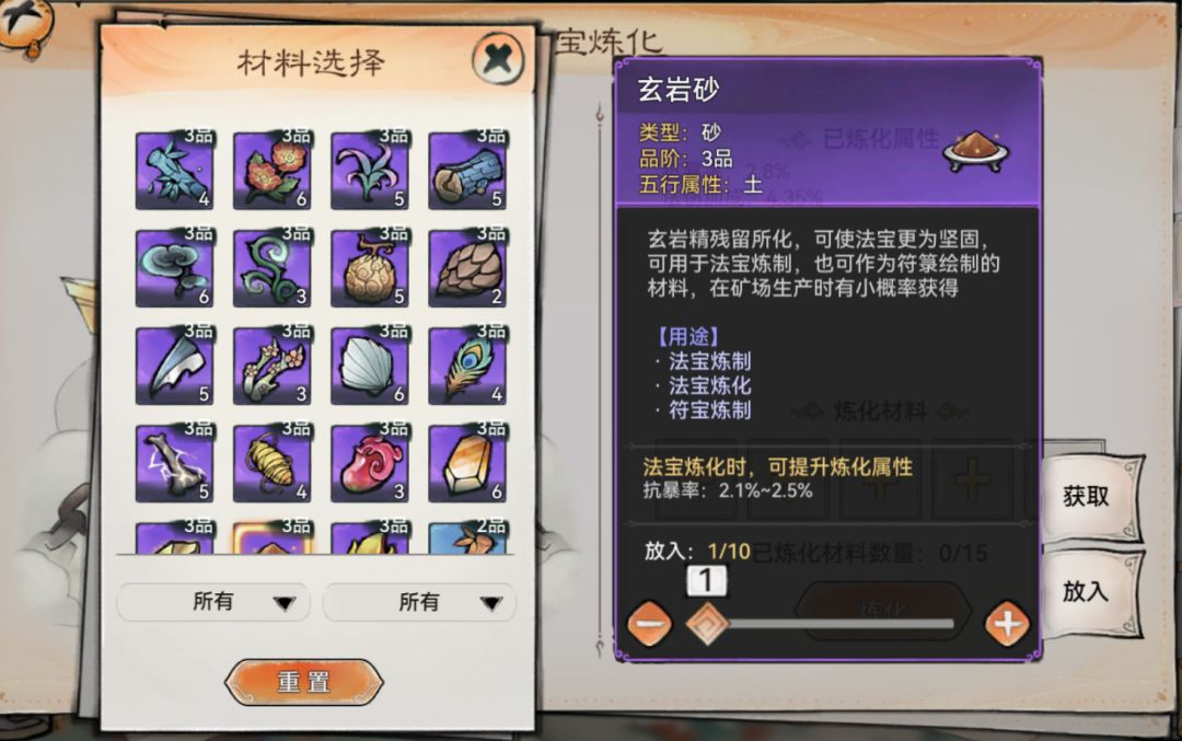 需要注意的是,炼化次数是有限的,根据法宝的品质不同,次数也就不一样,红色最高品质可以炼化15种材料。和法宝炼制一样,刚解锁法宝炼化的时候可以不用过多追求,优先炼化一套可以通用的法宝。