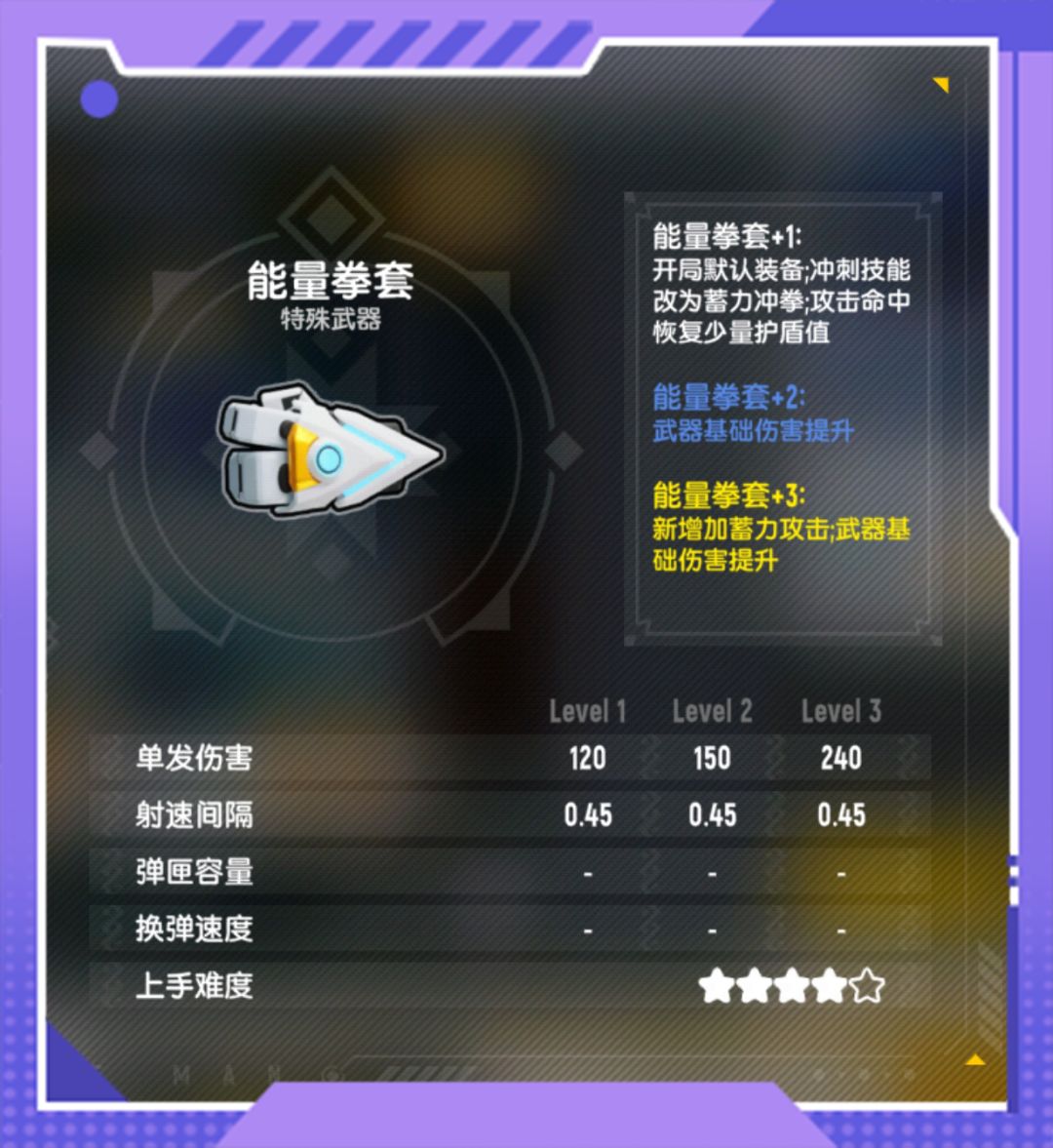 武器特色:冲刺技能改为蓄力冲拳,攻击命中后恢复少量护盾值