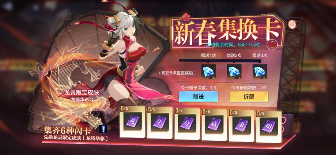 活动开启后,指挥官可参与【龙腾华彩】-【新春集换卡】活动,收集6种闪卡,可兑换龙灵限定皮肤【龙腾华彩】,同时也可以互相赠送集换卡,让我们一起与猎人们共同狂欢。