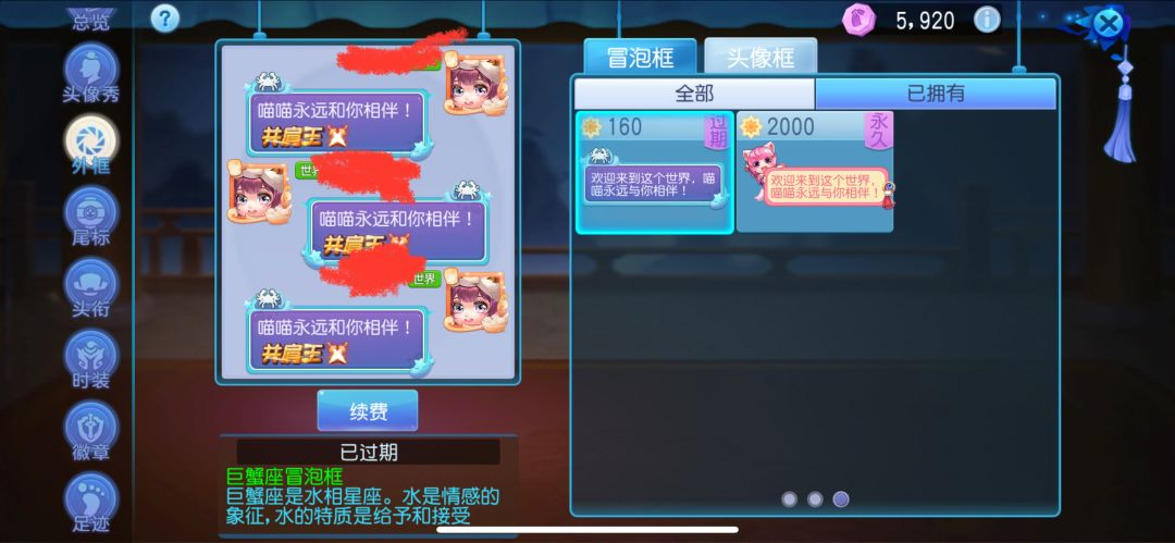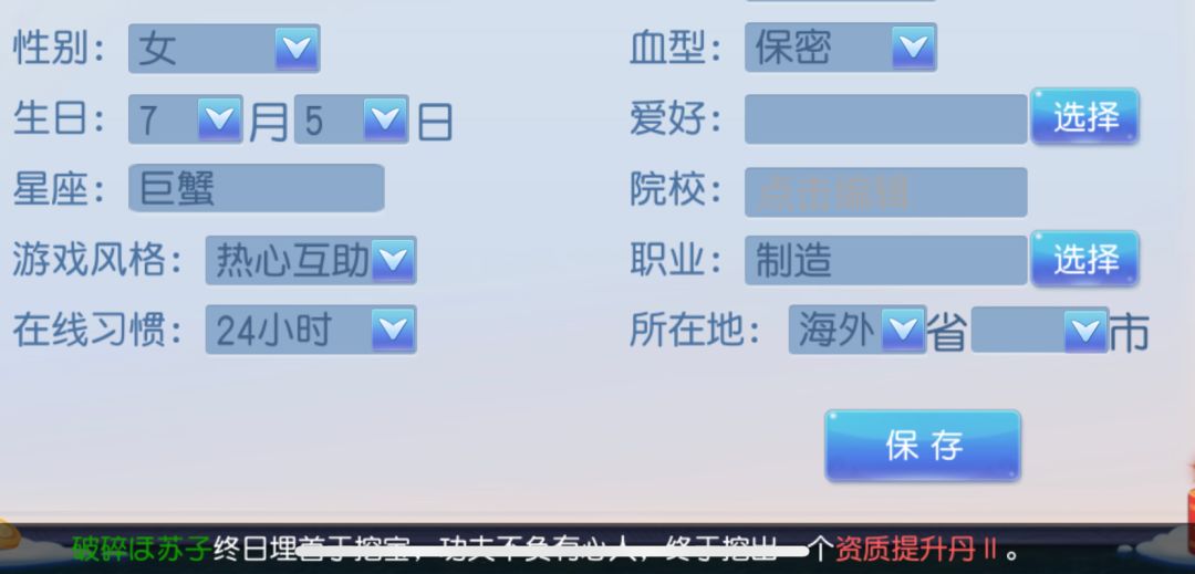 这个冒泡框其实跟我们设定有关系,大家可以看到我们上个截图的名字叫做巨蟹座的冒泡框,我们打开个人资料,可以看到自己设置一下自己的出生月日,就能得到不同的星座!