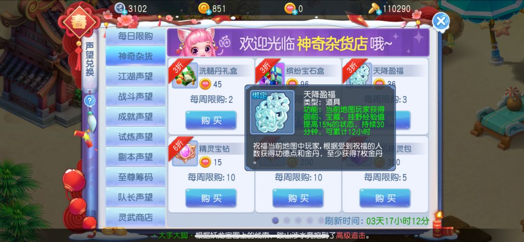 点开你的神奇杂货,就可以看到这样一个道具叫做天降盈福,每周都有三个打折优惠后36桃的单价,在介绍中,我们可以清晰的看到就是根据当前地图玩家多少获得功德,可以说,我们只需要花费少量的一些桃子,趁着大家都在线人数比较多的时候,把它使用掉就能够收获大量的功德,每周获得一个特殊的头衔,不需要太多的氪金也不需要高超的实力。