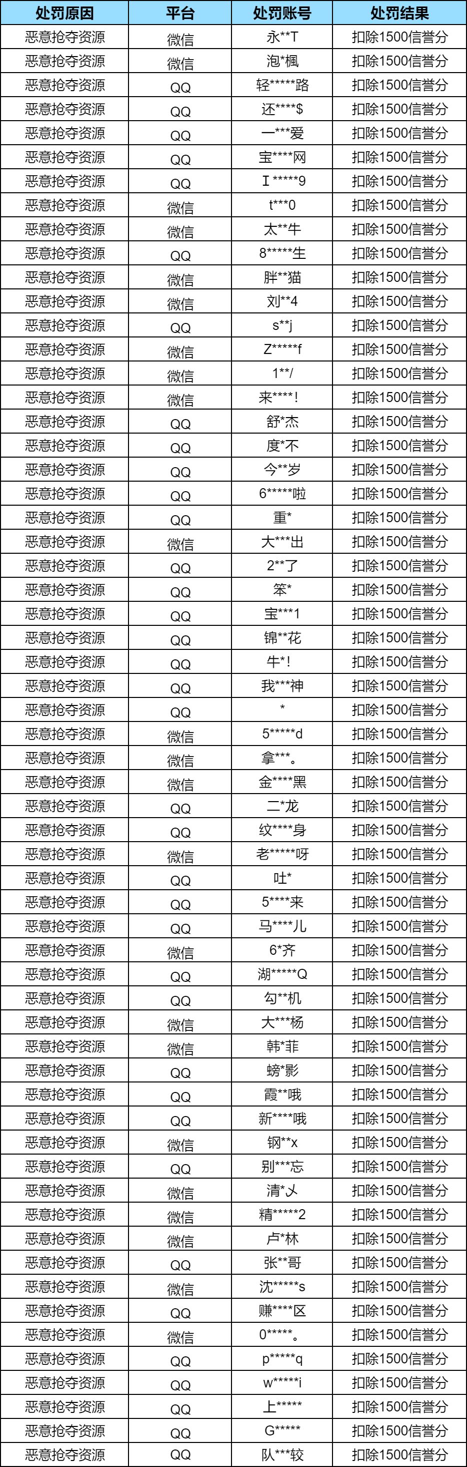 1月29日-2月4日期间,共处罚3982个作弊账号,以下为部分账号公示: