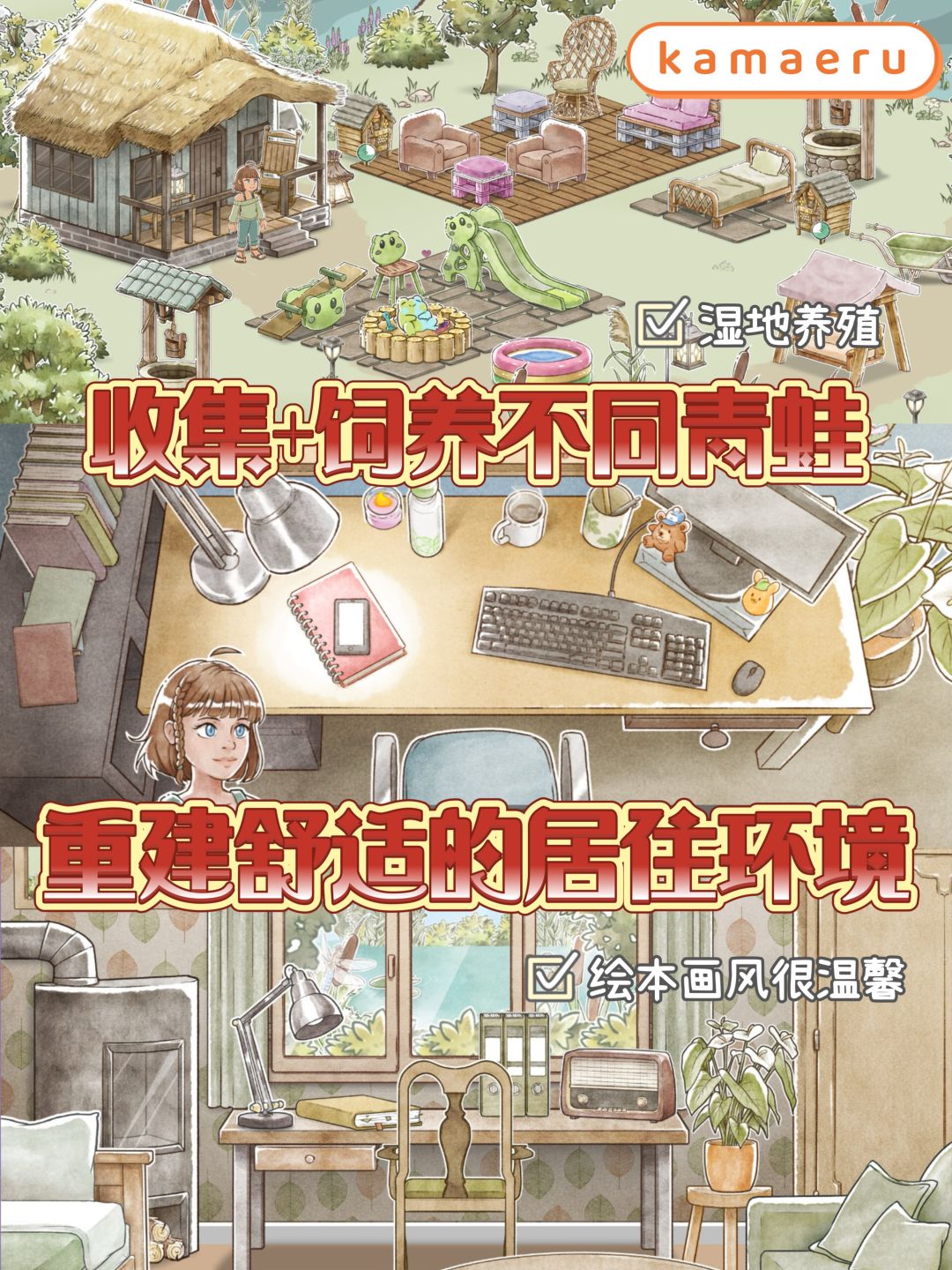 这是一款和环保有关的游戏 收集+饲养不同种类的青蛙🐸 建造适合它们居住的湿地 游戏的画风为绘本感觉 所以觉得很温馨治愈