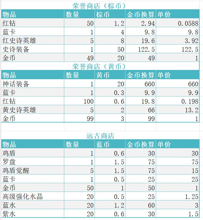 写这篇攻略,最主要的其实是想对比一下,商店里面买哪些东西是比较合适的,基本思路就是把几个常用商店的资源进行对比,最后归结为金币单价,表格里面所有的金币单位都是k。