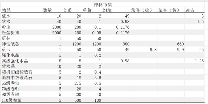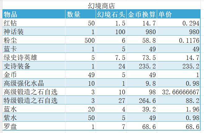蓝水紫水幻境最划算,粉尘神秘折扣最划算,神话装备荣誉商店黄币最划算,蓝卡荣誉商店棕币最划算,高级强化水晶幻境最划算