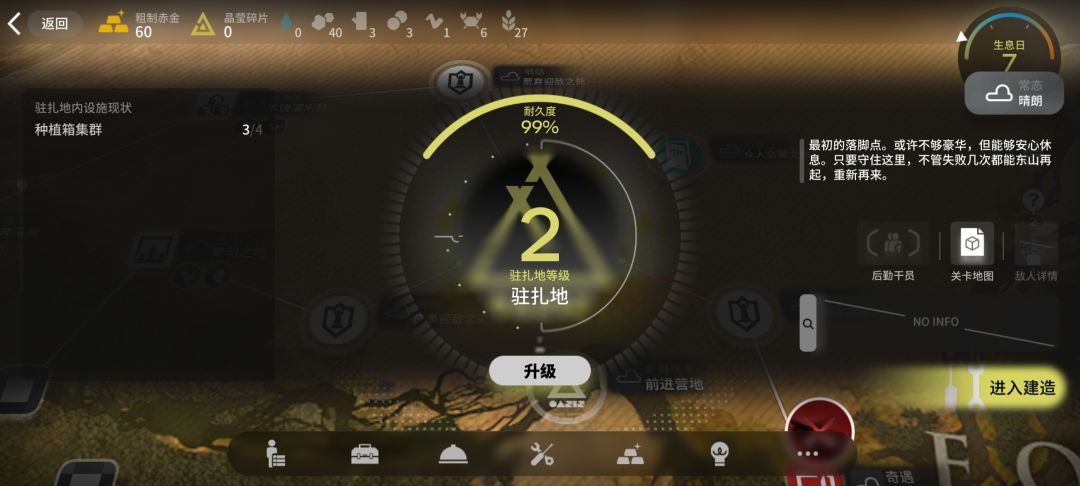 至于左右两边各一个的“不速之客”和下面的“战争本能”,缺钱没物资可以打一打,但注意都会刷新;其中只有两个外乡来客会刷敌袭,其余不属于“黄绿茂林”这个大区块的要塞都不会刷敌袭(存疑,但我基本没见过从其它区块跑来的敌人,也有可能是这两个要塞占用了刷怪)