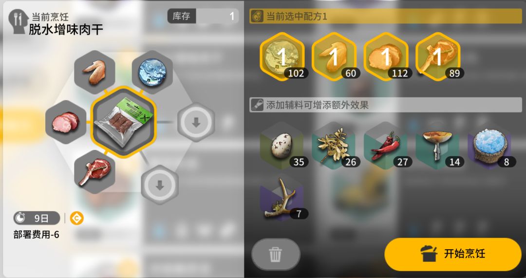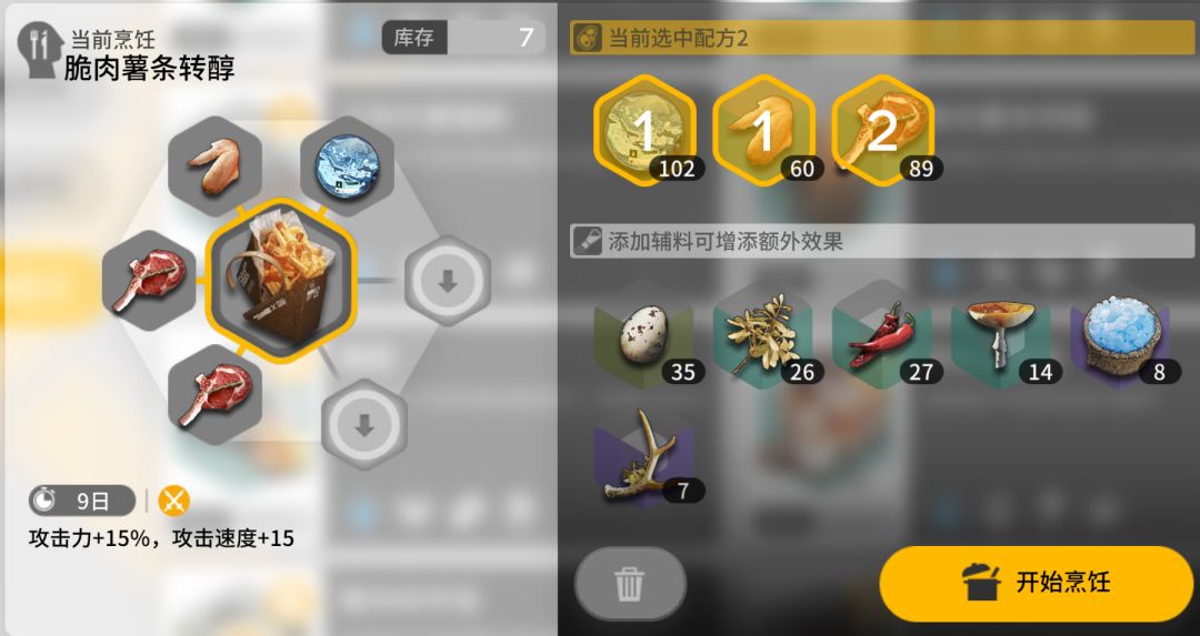⑤薯条料理的成本很低,并且有足足9天的保质期,但是加成却相当实用(+15%攻击力和15点攻速,配上双蛋或者双草调味料还能再加6%攻击力或者6点攻速),是日常喂叔叔42等主c的不二选择;而三个圆圆肉片做成的也相当简单实用,适合喂给先锋让开局更加丝滑,同样是日常就能一直吃的好东西。