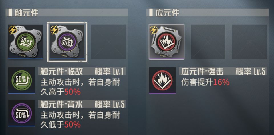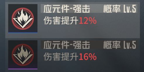 同时大家需要注意的是,元件也有品阶之分,比如蓝色和紫色品阶的“应元件-强击”,蓝色增伤幅度便为12%,紫色增伤幅度则是16%,所以更高品阶的元件也意味着更高的概率或者更好的效果。