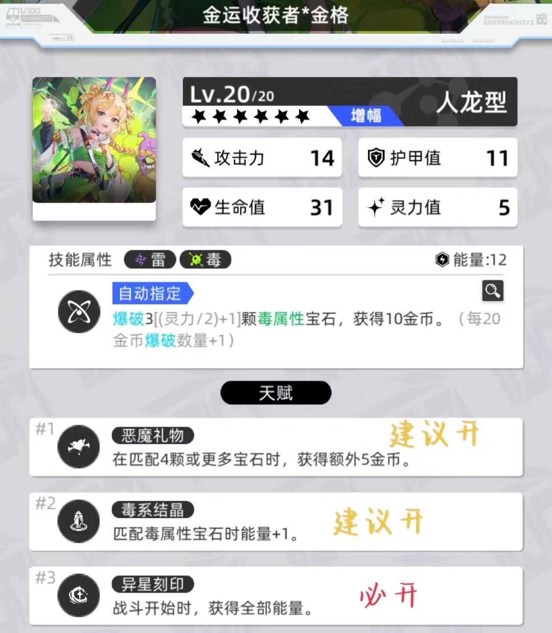 技能效果为爆破(灵力加成/颗)毒宝石,并获得10金币,能量需求12点天赋【1】【2】建议开启