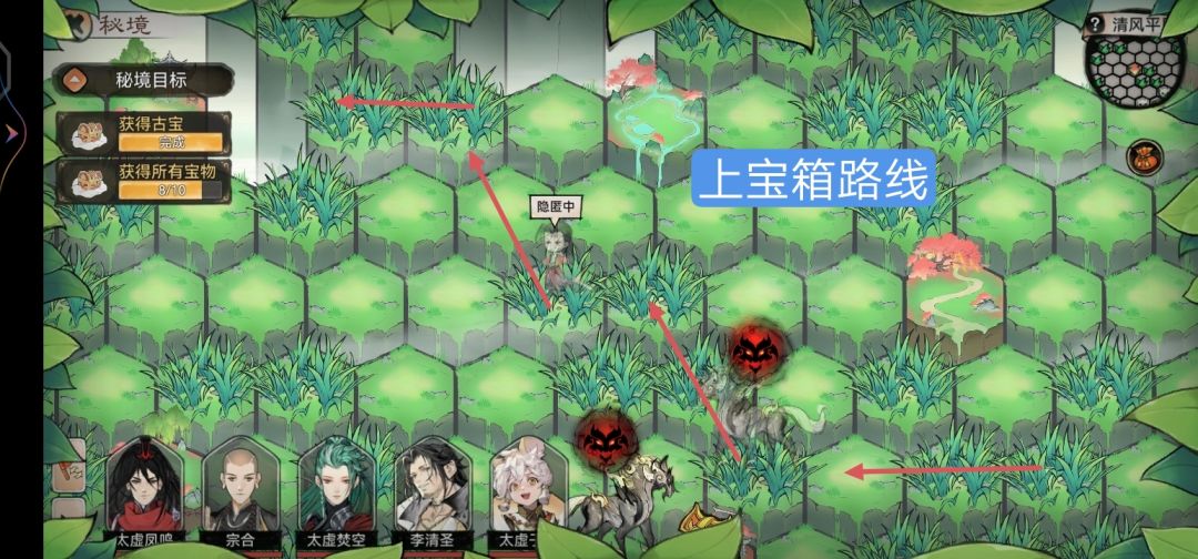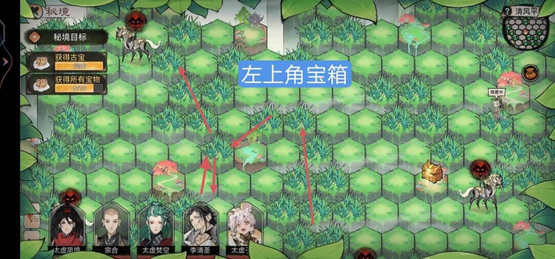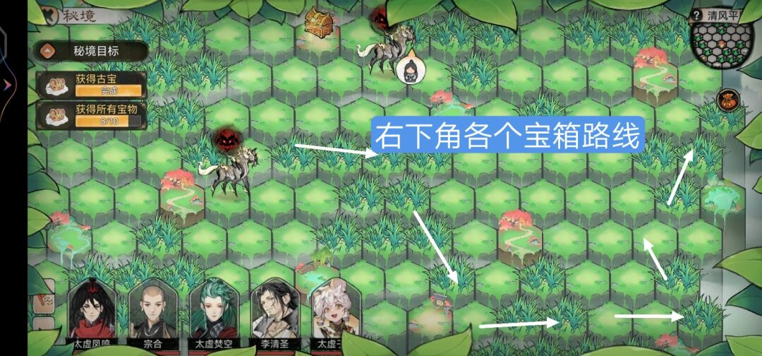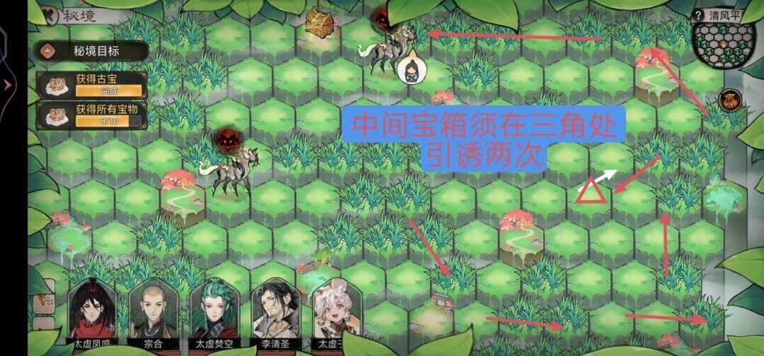 本攻略为强拿,拿到就战斗输掉撤出秘境!需要多次进行,优先古宝,其次周边宝箱,最后中间宝箱!不要进行重新挑战!