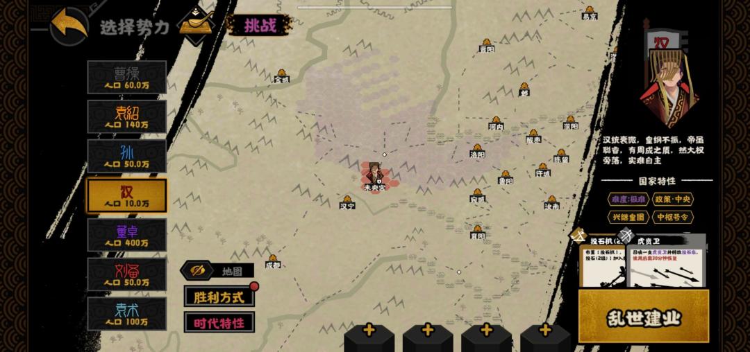 【兴继皇图】:初始处于傀儡状态,无法发起外交,无法加入【酸枣同盟】,可成立高集权的强力同盟类型【兴继皇图】