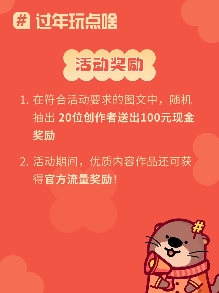即日起,在#过年玩点啥 话题中参与图文投稿,即有机会获得话题獭准备的现金好礼和巨额流量扶持!