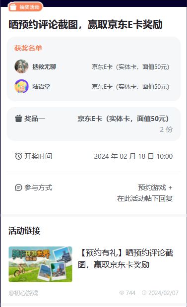 【🎁奖品内容】✨随机抽取2名幸运玩家,每名玩家送出京东E卡1份(实体卡50元面额,以最终实物内容为准)【🎁参与方式】已经点击预约游戏的玩家在本贴内回复预约评论截图即可参与抽奖(ps:不可盗用其他玩家截图)