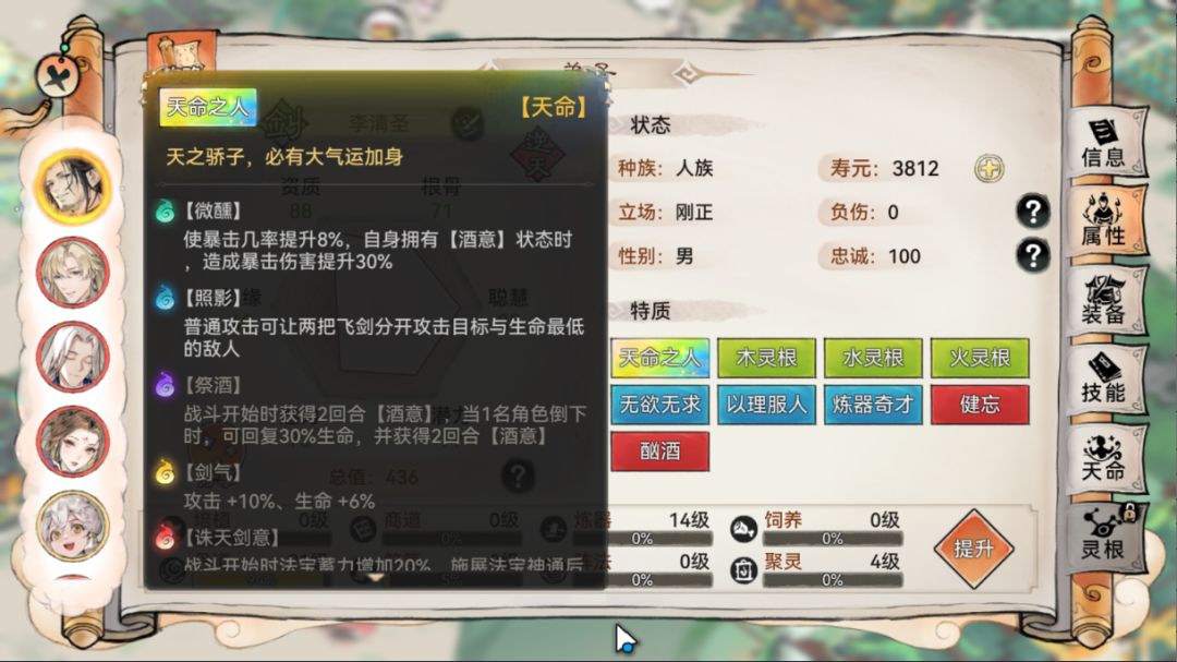 虽然主角团中没有逆天品质的弟子,但作为紫色品质他们就拥有着不俗的天命效果,其中大师兄韩飞羽更是橙色品质,主线任务中更是会有主角团灵魄赠送解锁更强力的天命效果