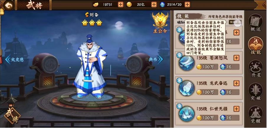 四星天赋“雄略”:伤害提高20%,目标如果有刘备1或3技能给其施加的负面状态则会被破霸体。