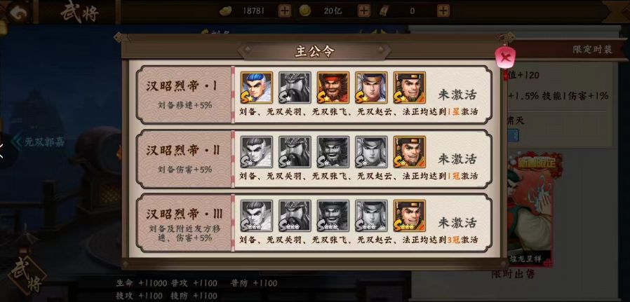 汉昭烈帝I: 刘备移速+5%,无双关羽,无双张飞,无双赵云,法正均达到1星激活。