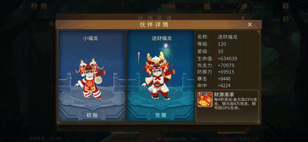 小福龙具备最强的初始属性和培养空间,新区玩家如若幸得小福龙,有成为主力配宠的实力。变异属性抗暴和闪避,两大防御属性专注竞技防守,闪避触发频率越高,逆境生存或反打的几率更大,抗暴曾能削弱对手触发暴击的频率,从而降低己方受伤害的程度。双重防御,更适合认主竞技武将排位使用。而送财福龙在攻防两端的送福buff,连贯增强武将攻击力和生命回复,在新区玩家开荒期,绝对是一大完美臂助,让我们三星通关征战版块副本和闯关更高难度副本变得高效而简单。