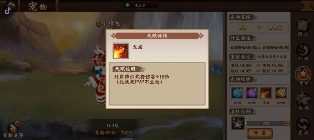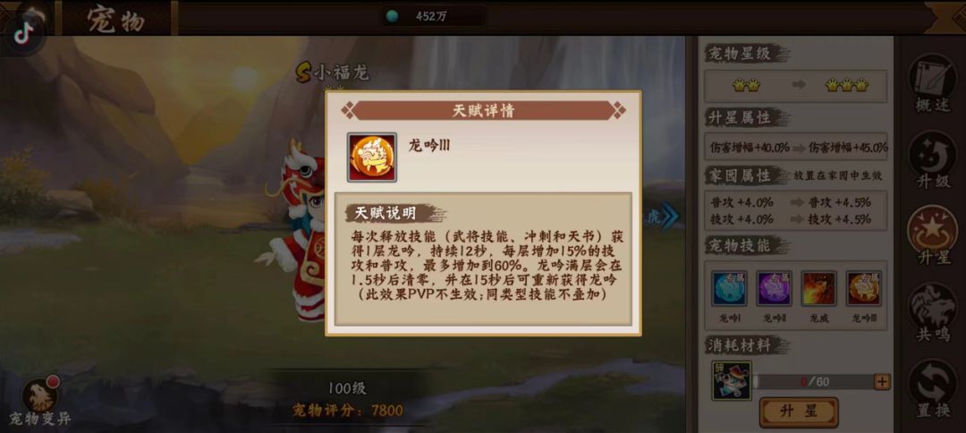 宠物升星会激活相对应的技能,不同于其他宠物,小福龙的技能激活要求为2星、3星、4星及1冠,分别可以激活龙吟I、龙吟II、龙威、龙吟III技能,一冠的小福龙不仅可以提升对应阵位武将10%伤害,更是可以获得技攻和普攻输出加成buff,极大的提升携带武将的攻击输出能力。