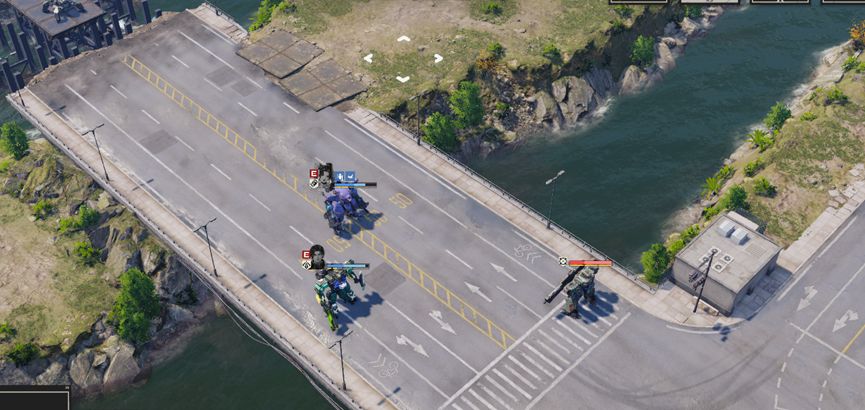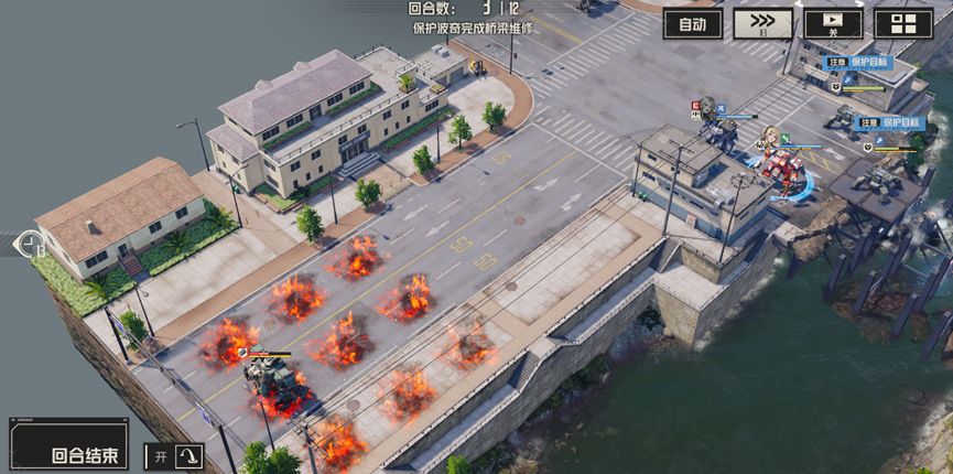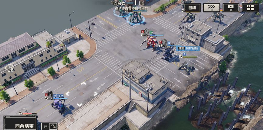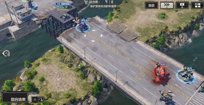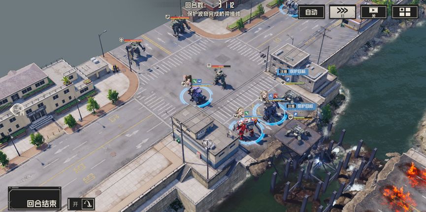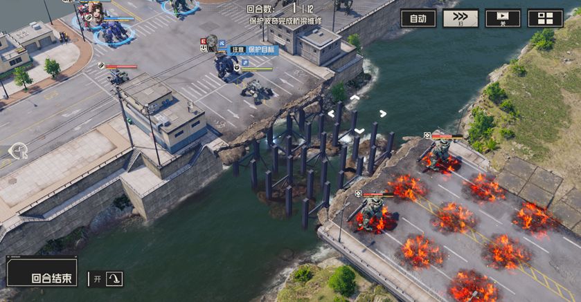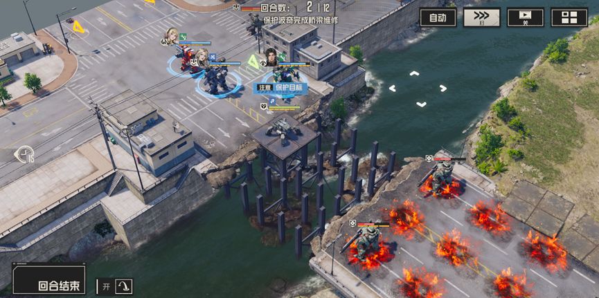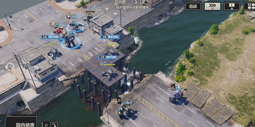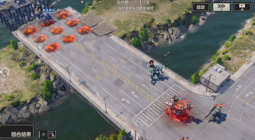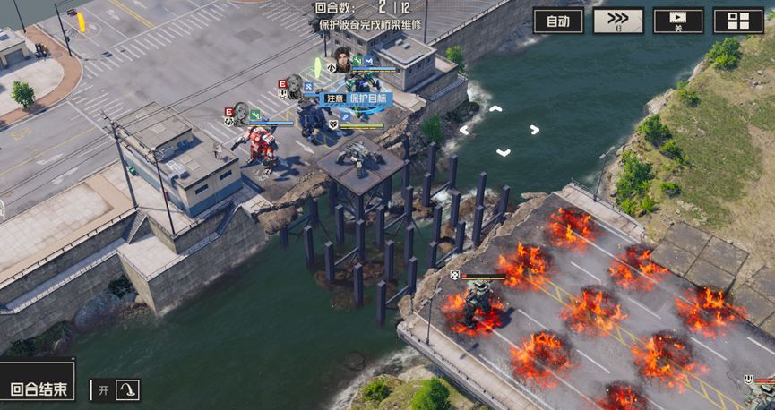 开局分别清理周围的敌人,尤其是河对岸的两个狙击兵,使用战术等远程攻击对其进行攻击,尽量在两回合内将他们消灭,随后部分人留守保护波奇,部分人携带飞行背包提前过河,击败威廉。此后继续消灭新出现的敌人,慢慢等待桥梁修复即可通关