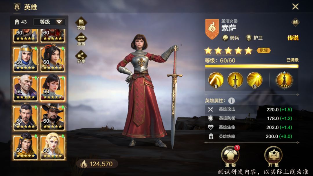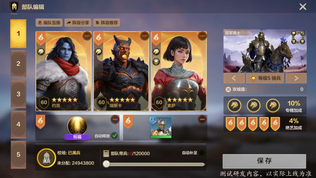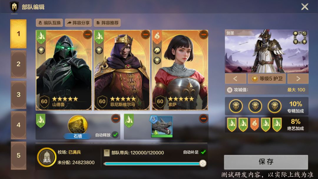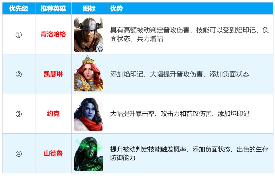 - 三位英雄技能特点是,自身兵力越高,技能伤害也越高,因此前期爆发输出较高,配合圣堂骑兵特性,可以迅速消灭敌方后排部队。