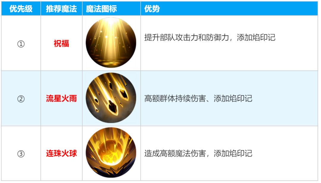 - 魔法选择上,祝福可以弥补防御力的不足,也可以配合英勇光环、瞬间移动或隐身术提升队伍机动性,从而实现出其不意,突袭消灭敌方后排输出的战略目的。