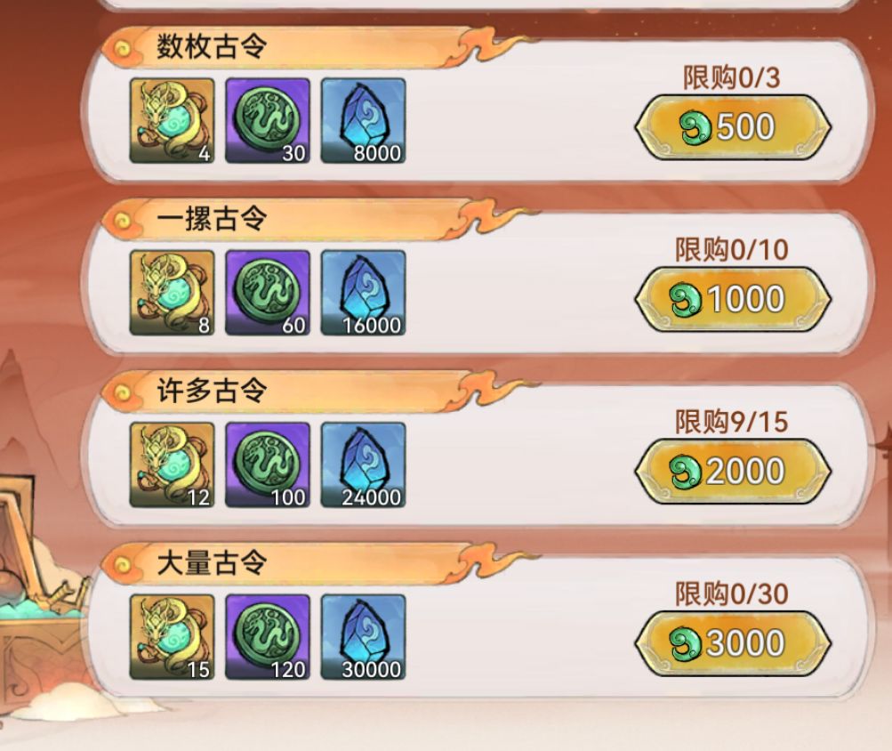 灵玉买仙古令记得买前两个档位500和1000的,是最值的。如果说在没有把握拿红色古宝,或者没有心仪奖励的情况下,仙古令是可以屯到以后使用的,所以可以吃个低保把该拿的天道传书、两本功法拿了之后就可以开屯。