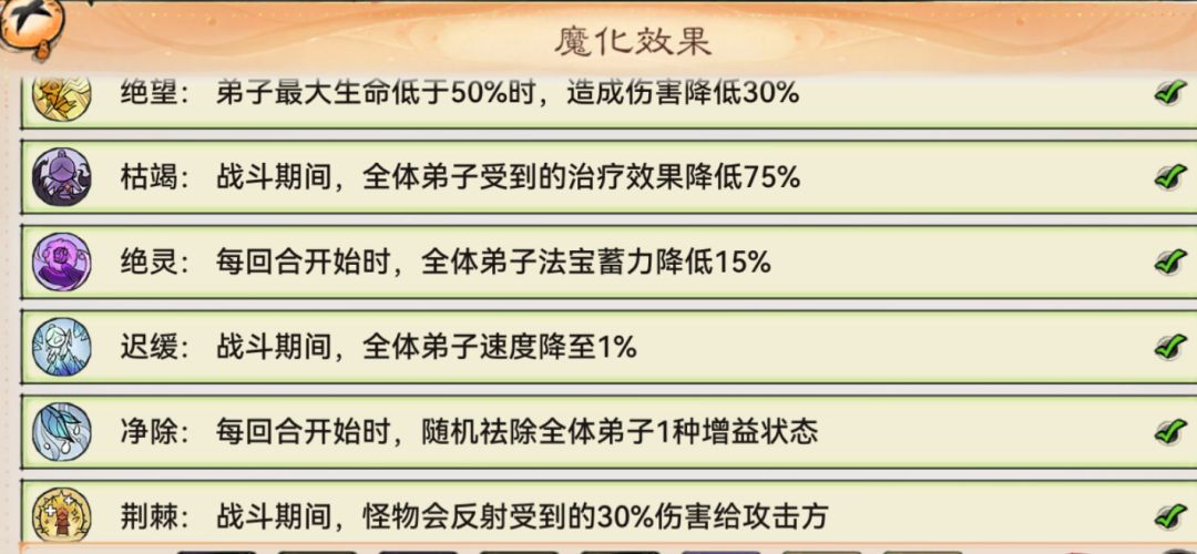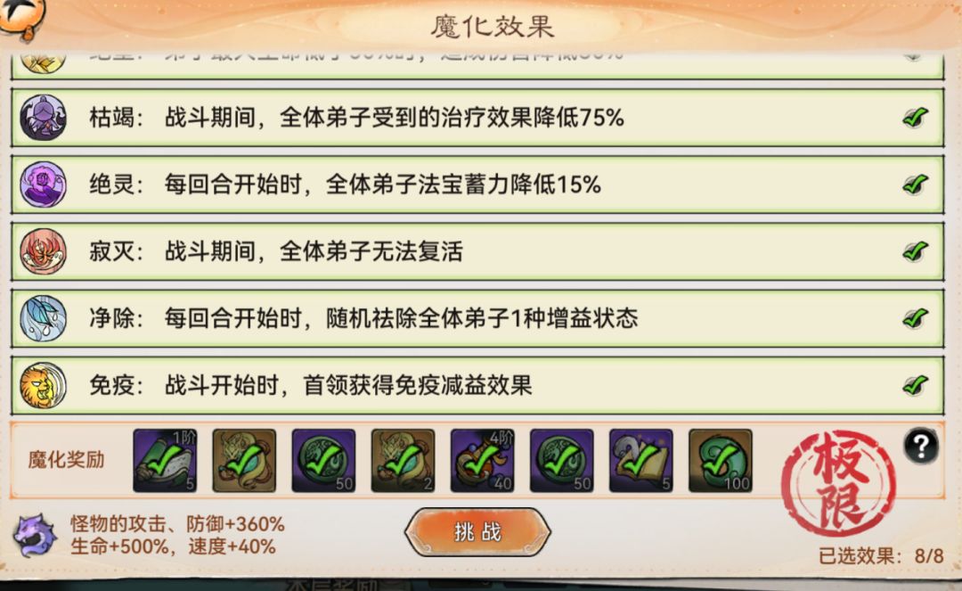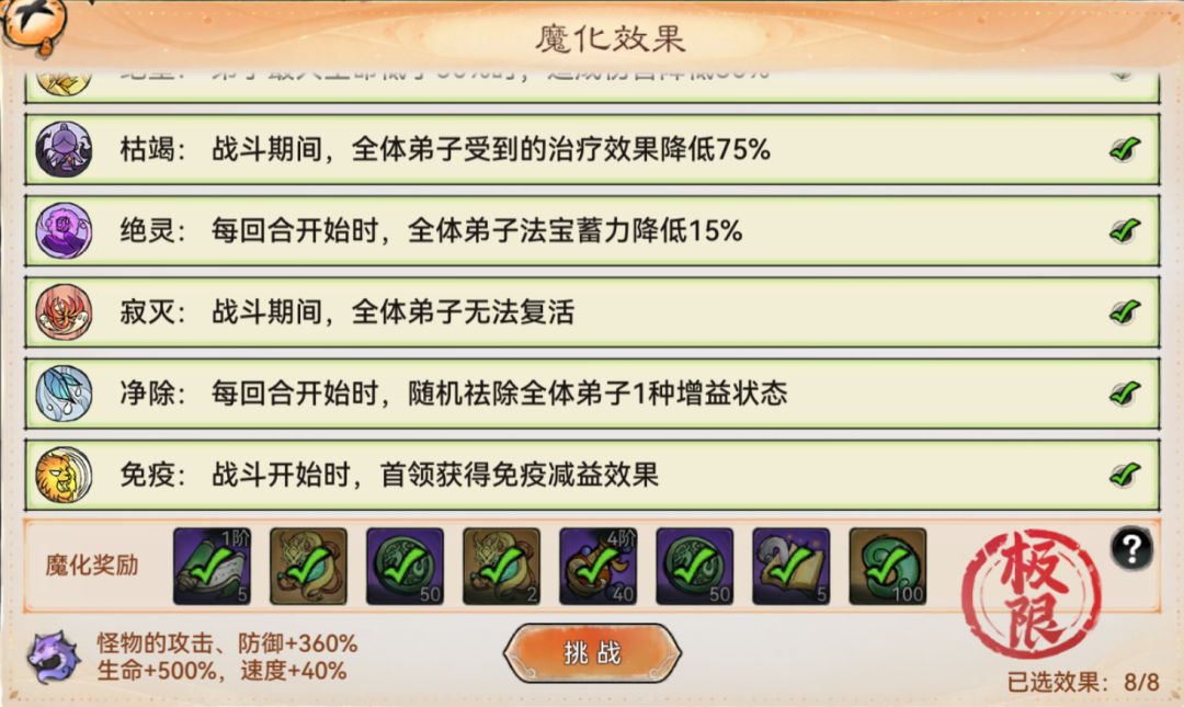 每一期的妖楼都有固定的魔化效果,每层也有不同的魔化效果。这期效果是首领的伤害会随着回合数越来越高,所以尽量不要拖。刚开始打的时候咱们可以不用把魔化效果拉满,先把不加额外效果的九层给推完,拿一个保底的宝箱奖励先,这样有助于后面的攻略。