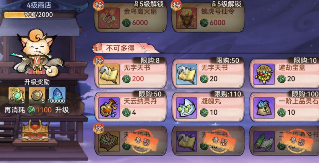 商店需要先购买低级的才能升级买高级的。一直以来炼体的丹药都很缺,1级可以选凝魄丸。2级选无字天书或者传道经书,优先无字天书。4级开放金色无字天书和天道传书,天道传书必拿,补全功法还能回一点血,其次就是拉满金色无字天书。最后5级能拿红宝拿红宝,也是以凑齐套装为优先,不够的话就继续金色无字天书。
