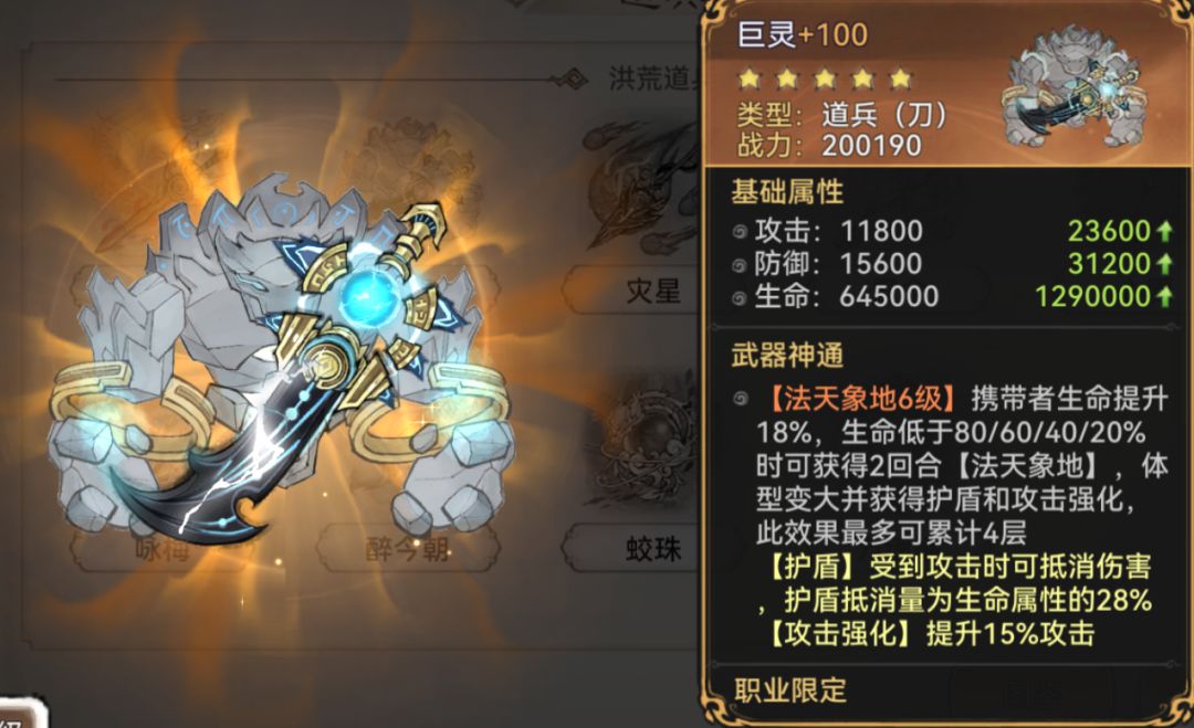 巨灵的职业限定是禅修和兵家,从神通效果上来看肯定是要给前排肉盾的,它更适合作为前排肉盾的装备。由于兵家有更适合的道兵,而禅修则更加契合巨灵。推荐将巨灵给予那些通过损耗自身生命来换取收益的弟子,如魂归咒录、燃灵歌诀等功法。