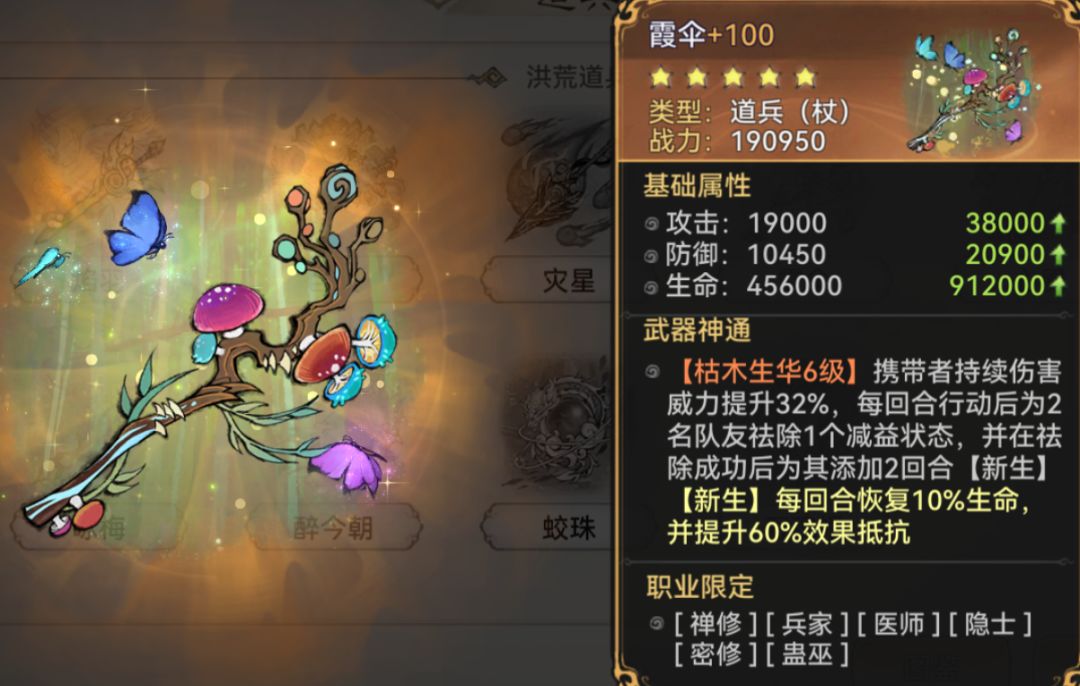 霞伞这个道兵是最适合蛊巫的了,持续伤害提升的同时还加了肉度,在这个不是你秒我就是我秒你的版本下,这个道兵的上场率不算很常见。但如果搭配肉盾阵容,主打控制和上毒,也是很亮眼的。霞伞还有一个不容忽视的抵抗效果,如果能成功清除减益状态,它还能为队友提供额外的抵抗效果和生命恢复,这对于前排辅助或像云瑶这样的弟子来说尤为实用。