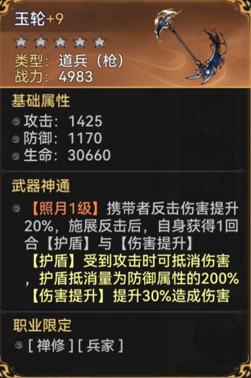 禅修兵家都可以用的枪,但更加推荐给兵家使用,因为兵家常常和反击挂钩,兵家本身就比较肉,这个道兵还能带来一定输出提升,瞬间弟子就变成了能打能抗的前排。玉轮相比巨轮舍弃了一点肉度,但提高了伤害,可以在一定程度上弥补一些输出。