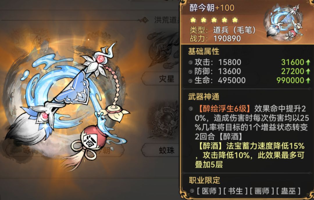 醉今朝是一件无可争议的PVP专用道兵,它完美地契合画师的使用。画师通常以速度和控场能力为主,一般就是一速打控制清增益,有这个道兵的配合可以使画师的效果命中更高。