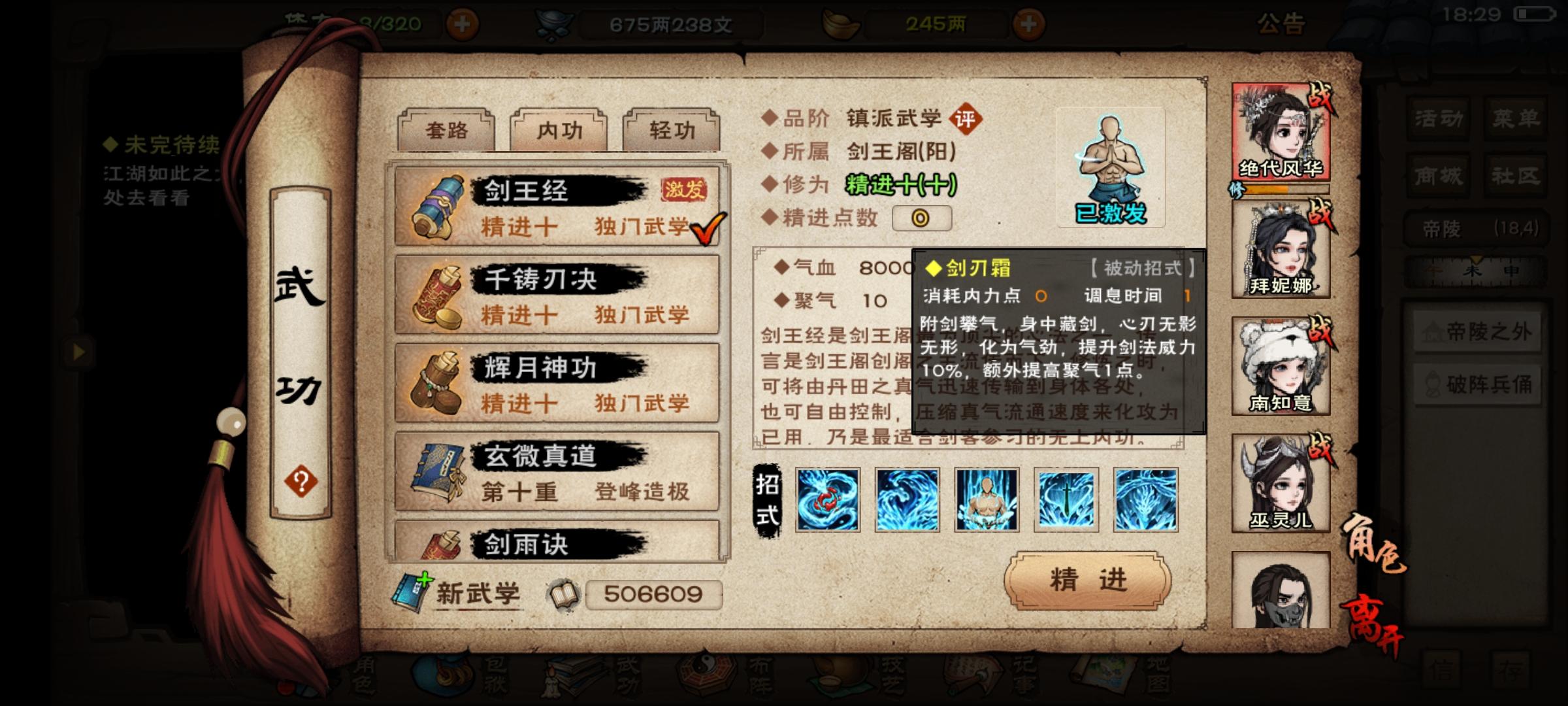 在剑王阁用舞殇剑诀➕剑王经(龙渊强化10)➕踏月留香。天刀门就舞殇(只谈论剑主)➕千铸➕踏月。