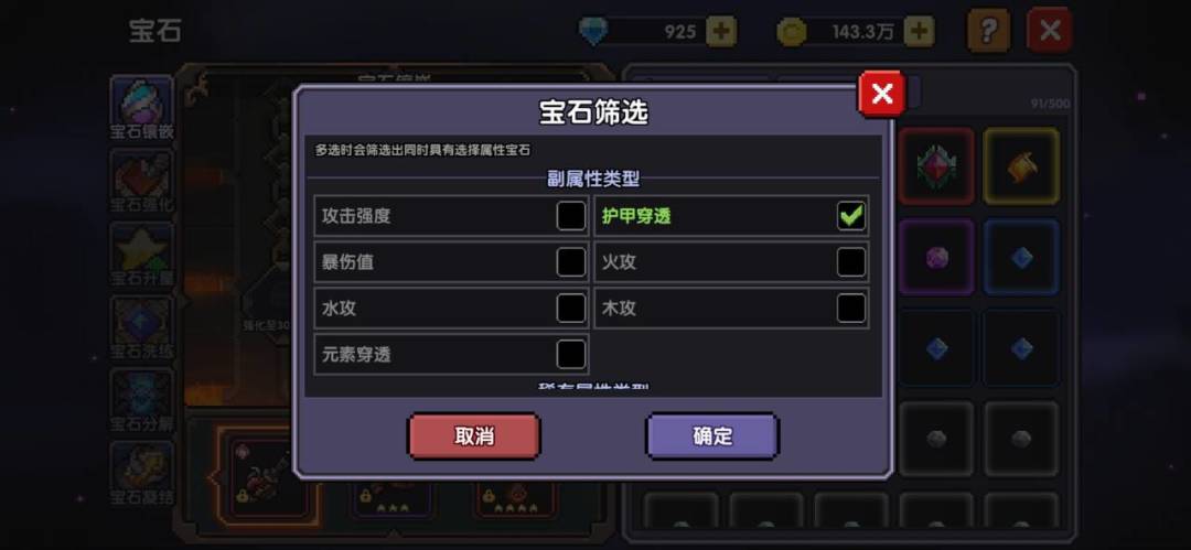 筛选需要的属性,把白蓝紫色宝石拿来升星,装备和使用