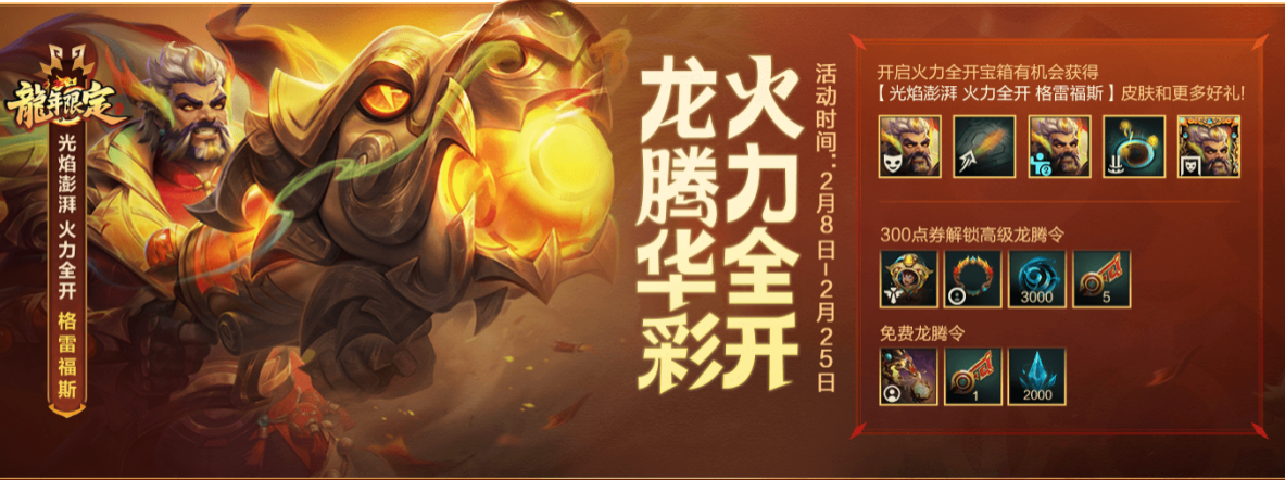 光焰澎湃 火力全开 格雷福斯也将携全新活动与我们见面!龙腾华彩 火力全开活动将在2月8日10点陆续开启-2月25日。召唤师于活动期间完成任务升级龙腾令,即可免费获取龙腾秘钥*1,蓝色晶石*2000,头像“灯火龙腾”。